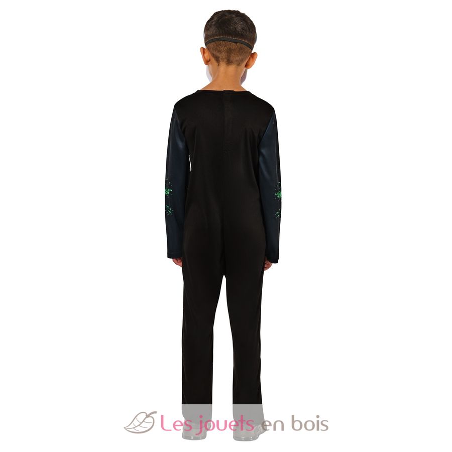 This children's costume includes a black jumpsuit with printed skeleton patterns and a skeleton mask.