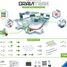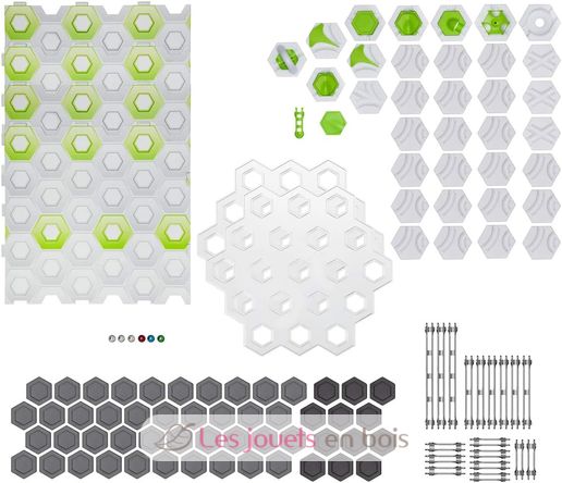 Contents: 4 cardboard plates, 2 transparent platforms, 6 marbles, 40 thick building blocks, 12 thin building blocks, 1 3-in-1 block, 1 starting block, 21 turns, 3 intersections, 2 switches, 1 whirlwind, 1 magnetic cannon, 3 long rails, 6 medium rails, 9 short rails, 1 arrival marker, 4 base blocks with inserts: 2 catchers, 1 free fall, 1 splash, 1 arrival, 1 user guide, 1 notebook exercises.