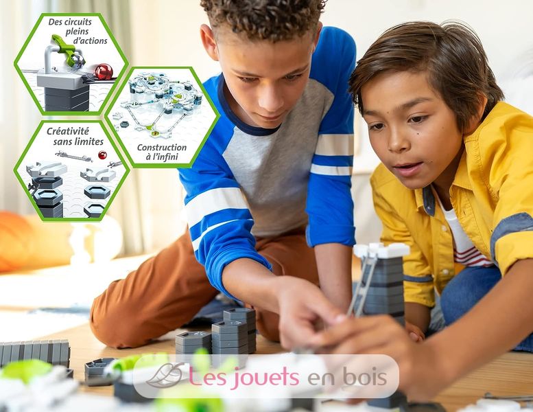Combine building blocks, platforms and rails to create your own courses and let your creativity run wild. With GraviTrax, the building possibilities are endless! Thanks to the different elements, your marbles will be able to be propelled at full speed, overcome incredible obstacles, fall or even climb levels, and you will discover with them the laws of gravity!