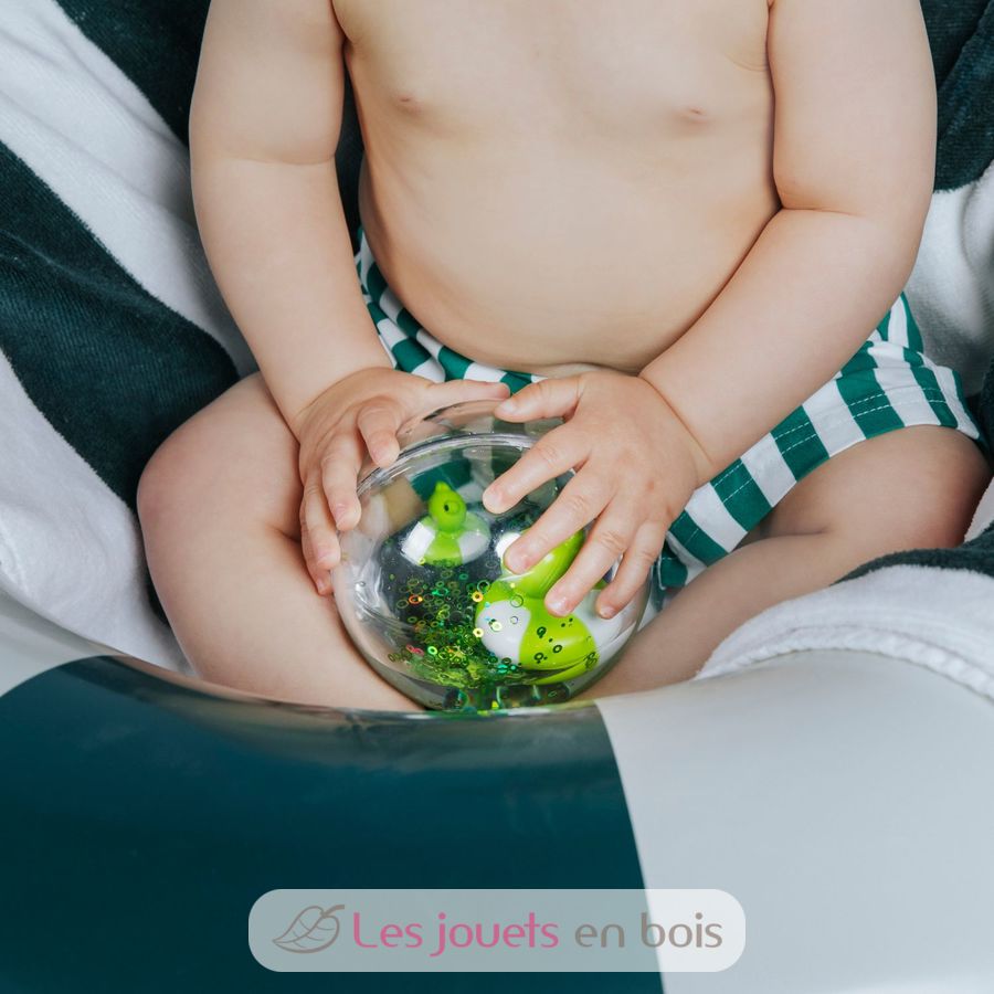 Ideal for playing in the water, this Happy Bubbles Froggies floating ball is an original bath toy for children 12 months and older. This transparent sensory ball stimulates the curiosity of toddlers who can watch the animals and their babies float and swim inside the bubble among the sparkling glitter. A real treat for the eyes!