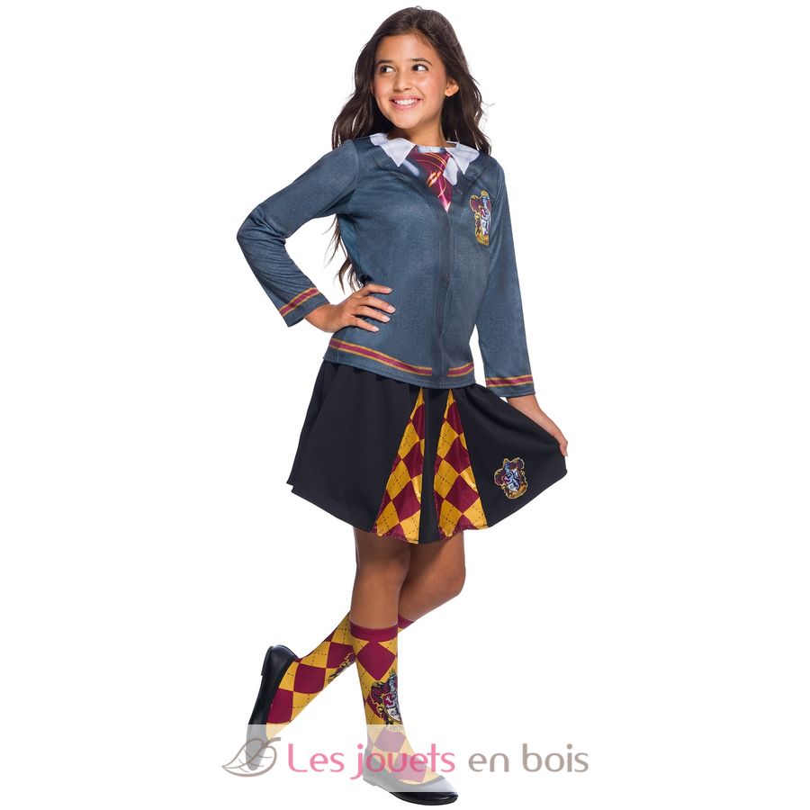 This children's costume includes a black jersey fabric skirt printed with Gryffindor colours, featuring an elasticated waist and the Gryffindor crest on the front; and a blue-grey printed long-sleeved top.