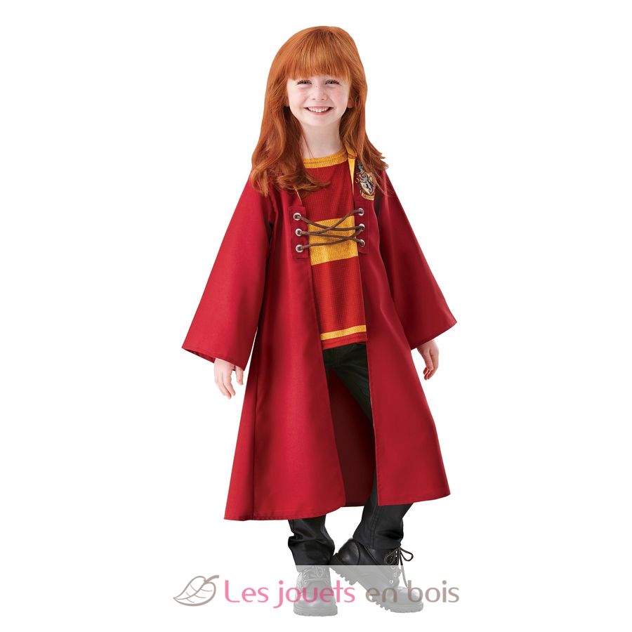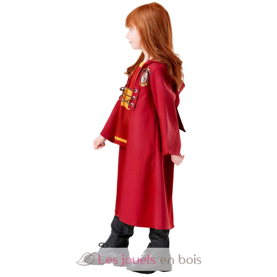 This children's costume includes a red and yellow fabric quidditch cape with an integrated hood, the Gryffindor crest printed on the chest, lace-up fastenings on the front and a printed jersey top integrated into the cape.