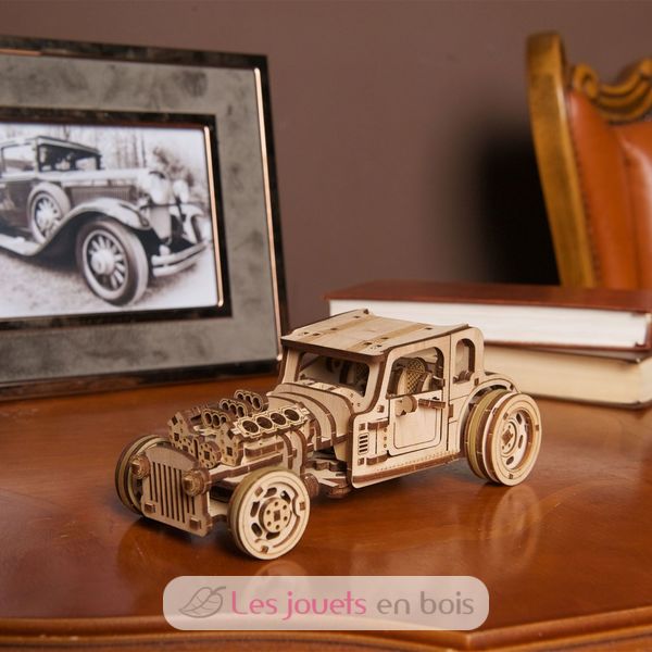 Assemble this plywood model step by step, without using glue. The Hot Rod Furious Mouse car model has dual engine functionality: you can wind the spring motor by giving six full rotations of the ratchet key located on the model car's undercarriage, or you can simply pull the Hot Rod back along a flat surface then release and watch the car speed off, as you would with any pullback toy car. Turn the front wheels of your Hot Rod left or right to make graceful turns, or race down the straightaway. Other details in the Ugears Hot Rod Furious Mouse include realistic scaling, wonderful detailing on engine and interiors, and twin doors with lock and handle mechanism.