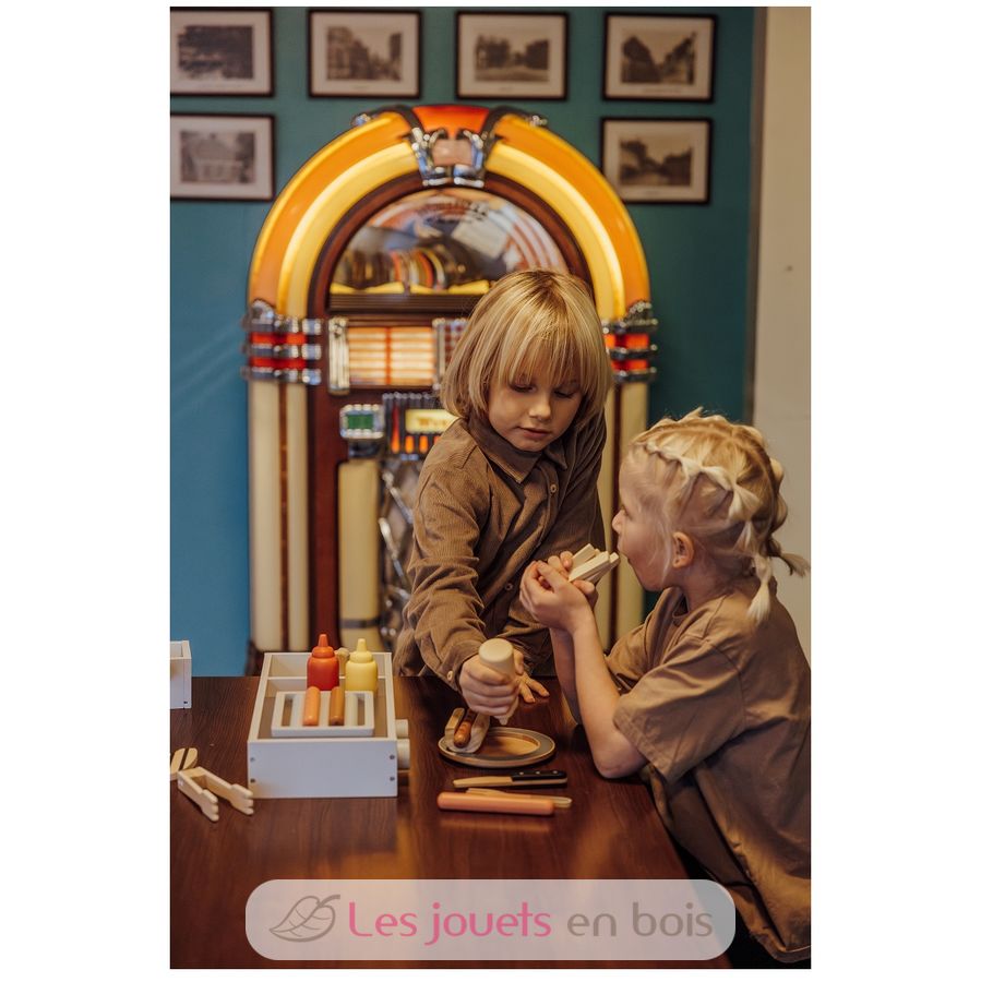 Elevate children’s playtime with this Fast Food Hotdog stand, designed for hours of imaginative fun! Crafted from durable wood, this charming playset brings the excitement of a Fast Food stand right into homes, offering everything children need to run their own Hotdog stand complete with fries, ketchup and much more.