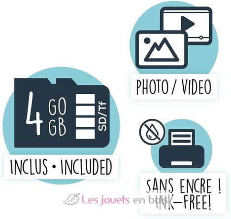 Black and white, ink-free printing with thermal technology. 3 paper rolls included. You can print 100 photos with the 2 standard rolls and 20 stickers with the sticky roll. Photo size: 7 x 5.5 cm. A 4GB micro SD card is included to save your photos and even make videos. With the dual lens, you can also take selfies, apply filters or even enable the flash!