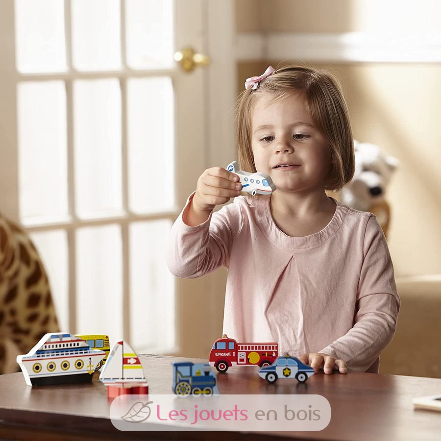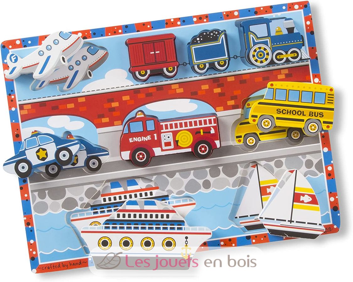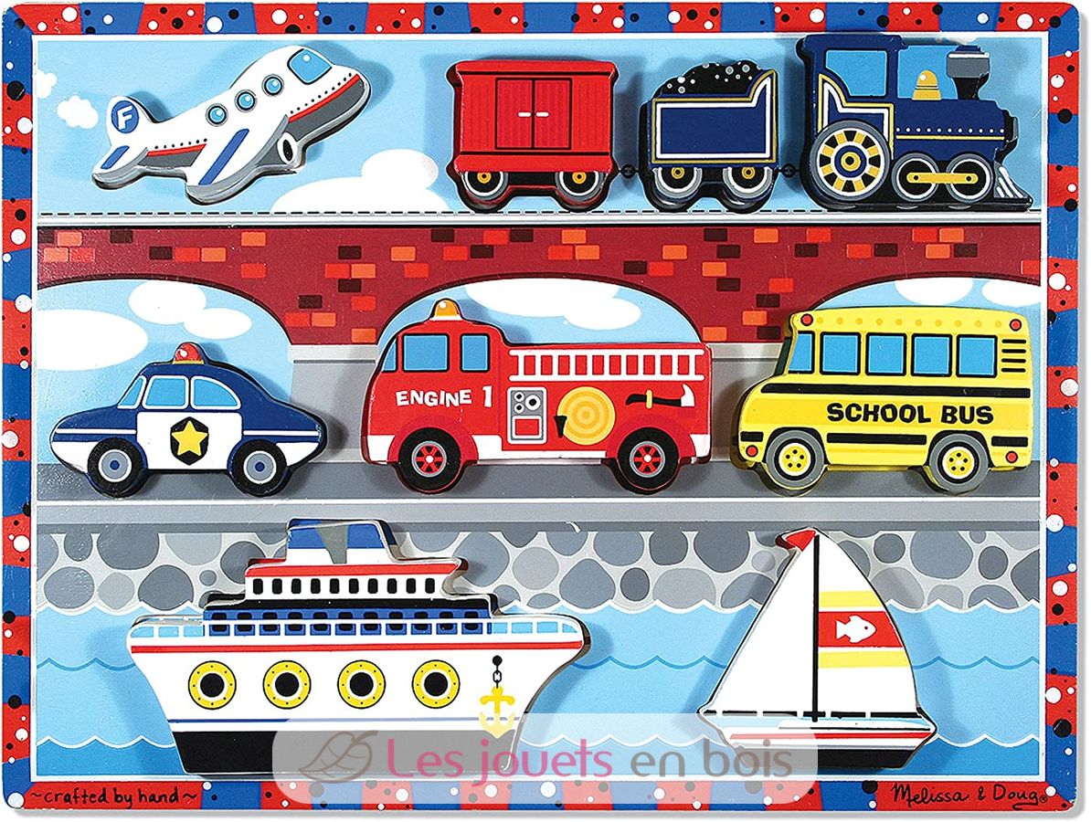 On the road, on the railroad, on the sea and in the air, the imagination has free rein thanks to this thick wooden puzzle. It features nine chunky, easy-grip vehicle parts that can stand upright for pretend play. A matching color image appears under each vehicle. Promotes hand-eye coordination, fine motor skills and creative expression.
