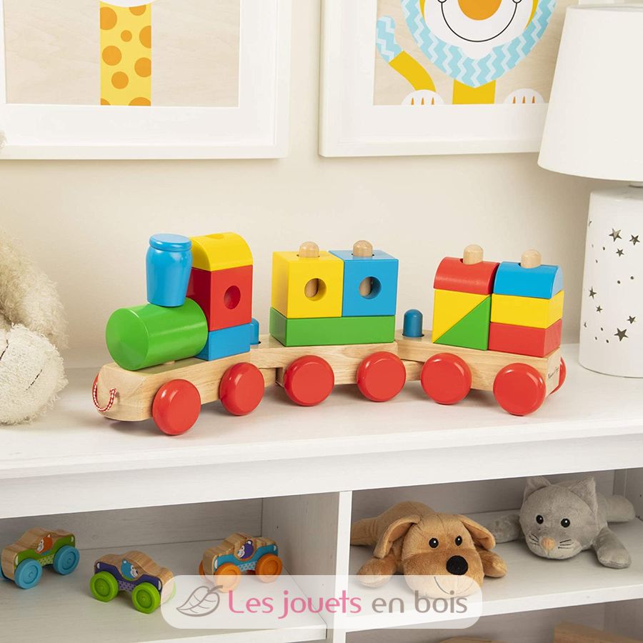 Set the scene for imagination and creative play! Get early learning skills off to a rolling start with this oversized version of a classic wooden pull train toy, great for older toddlers (ages 2+) or as a decorative piece in a nursery or playroom. Stack, sort, build, and count the 14 beautifully crafted solid-wood blocks in red, yellow, green, and blue that fit onto three interlocking rolling natural wood train cars. When connected, the train stretches more than two feet long!