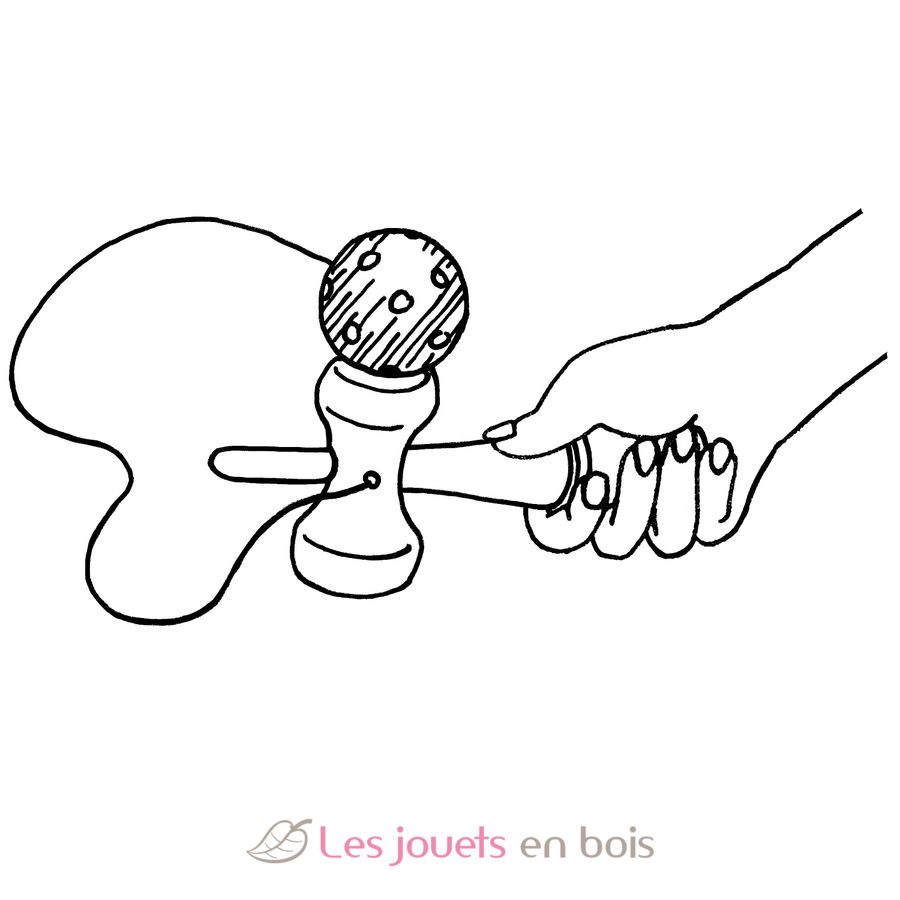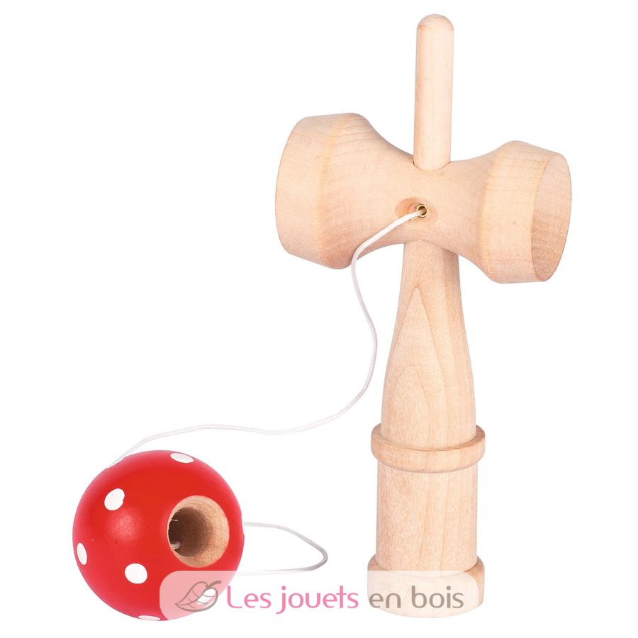 In this skill game, the wooden ball hangs from a ribbon attached to a handle made of solid wood with two hollows and a small shaft. A hand grabs the handle and throws the ball up, the ball lands in one of the hollows or is impaled or, more likely, as it dangles next to the handle, still bored.