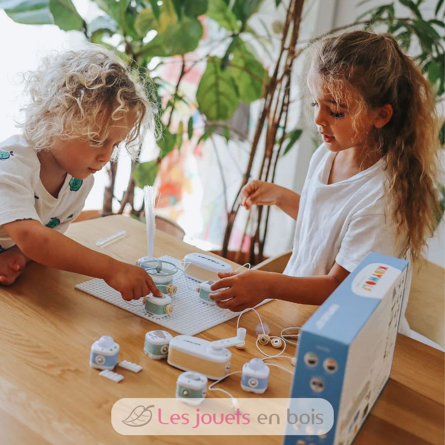 The Kidyelec Starter kit contains 11 electronic blocks to assemble (motor, LED, switch, propellers, etc.), with simple clip connections (no tools required). It comes with a step-by-step booklet with fun and visual explanations that allows children to build several circuits of increasing complexity for progressive learning.