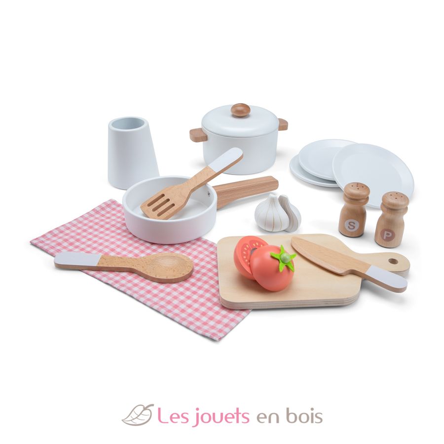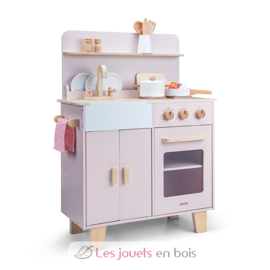 The kitchen features turning knobs with a clicking sound, an oven with a clear door, a sink with a faucet, and plenty of storage space for all their kitchen essentials. A complete wooden kitchen with 16 accessories: 3 plates, 1 frying pan, 1 pot with lid, 1 tea towel, salt and pepper shakers, 1 cutting board, 1 tomato, 1 garlic, 1 knife, 1 spoon, 1 spatula and 1 utensil pot.