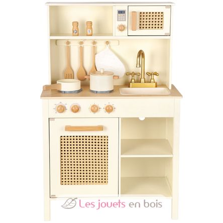 The natural-looking rattan details add a touch of elegance, making this kitchenette a stylish addition to any playroom or living room. Whether little ones are cooking up a meal or playing restaurant, this kitchenette is prefect for roleplaying and will keep your kids entertained for hours on end. Worktop height is 55 cm.