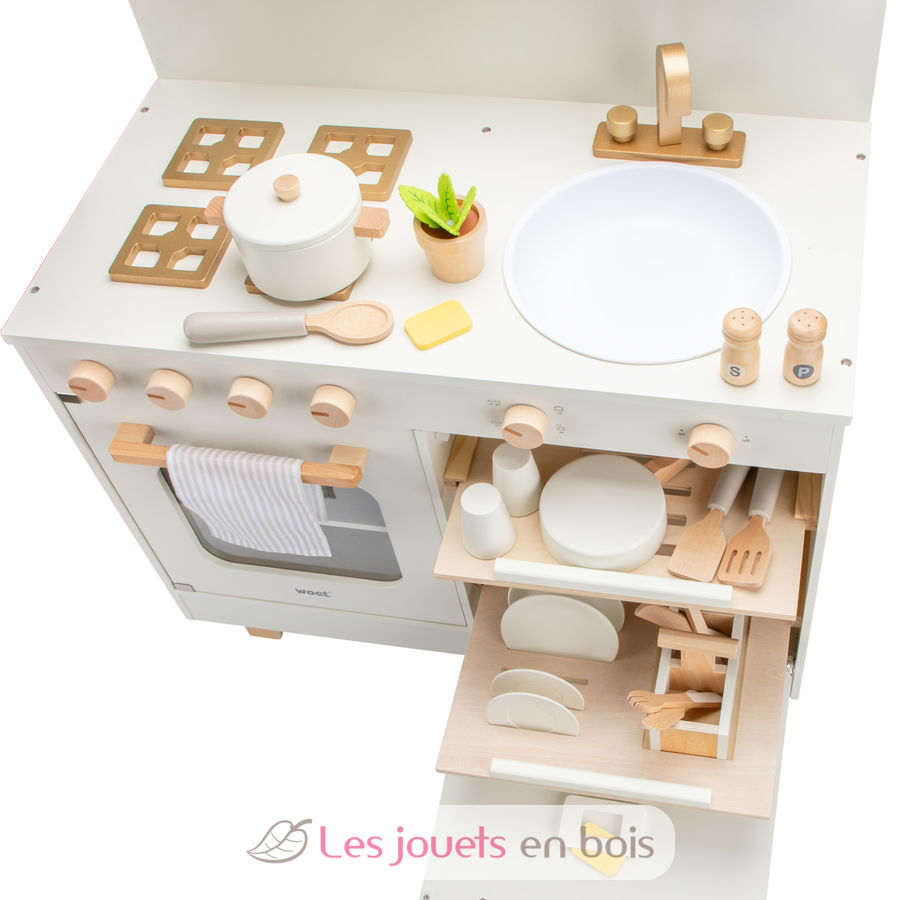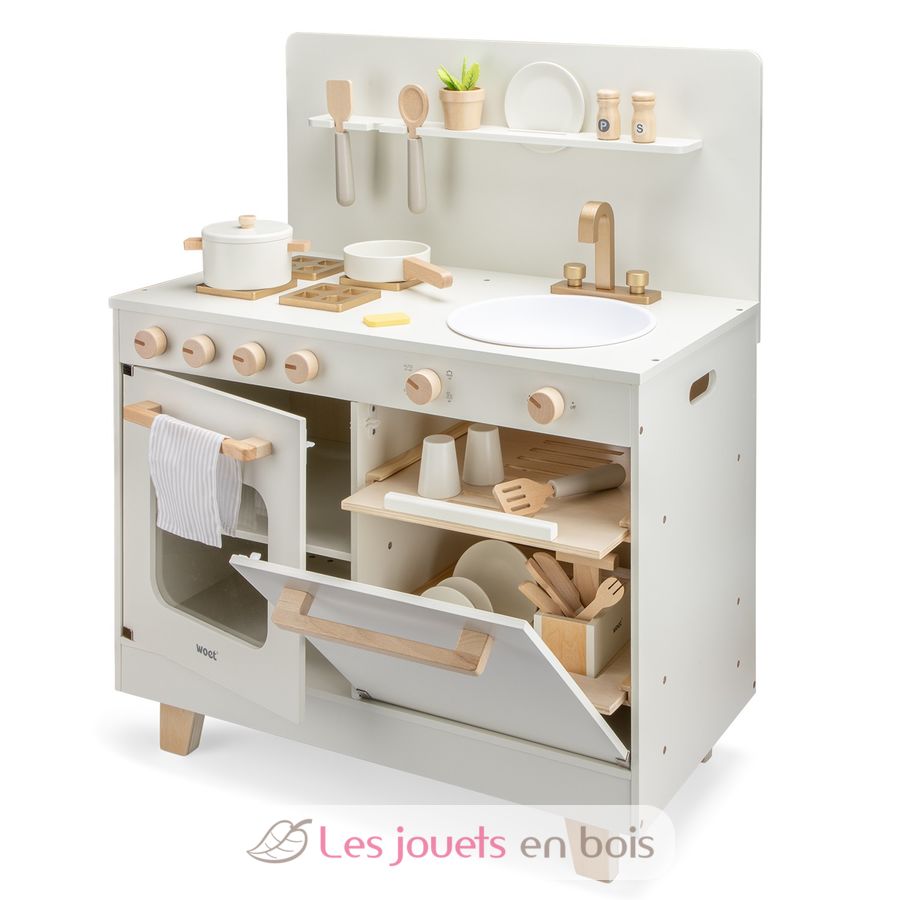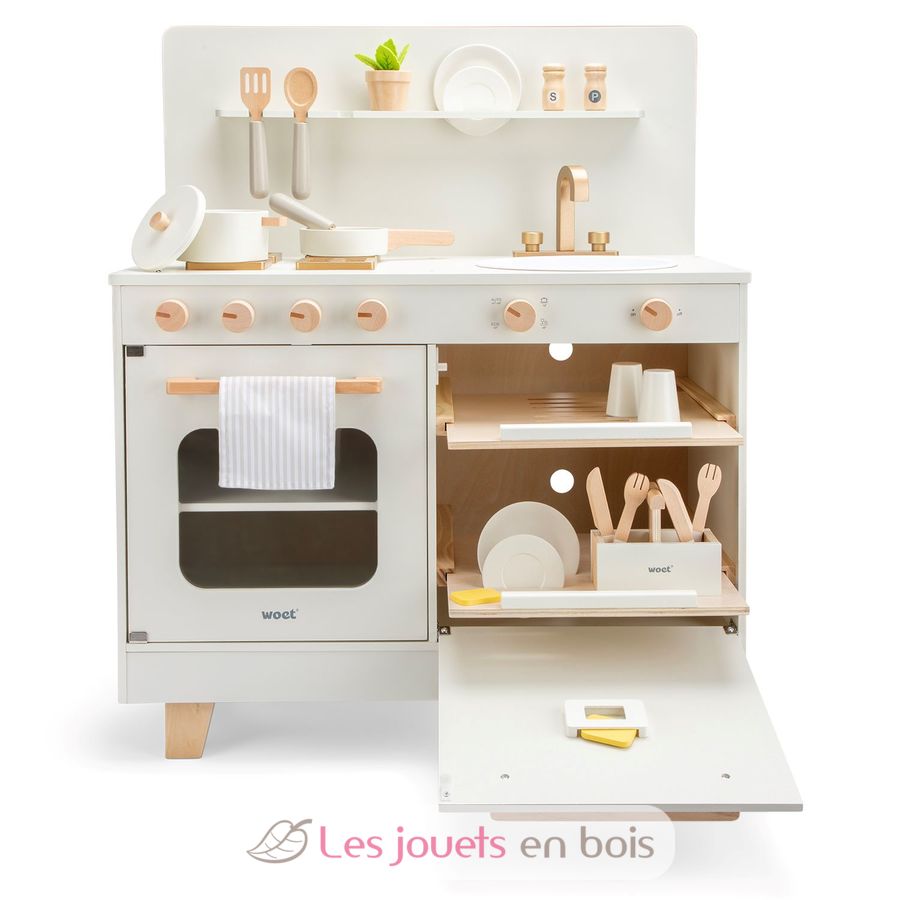 It features a built-in dishwasher with a cutlery tray, adding a playful, realistic touch that lets little ones mimic everyday routines. Equipped with a stovetop, oven, sink, and dishwasher, this toy kitchen invites children to explore everyday routines through imaginative play. From turning knobs and preparing pretend play meals to rinsing dishes and loading up the dishwasher, every detail encourages creativity, roleplay, and social interaction.