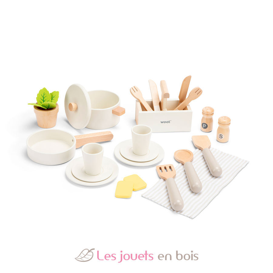 The pretend play toy includes over 20 wooden accessories from pots and pans to plates, utensils, and a wooden potted herb for hours of meaningful play.