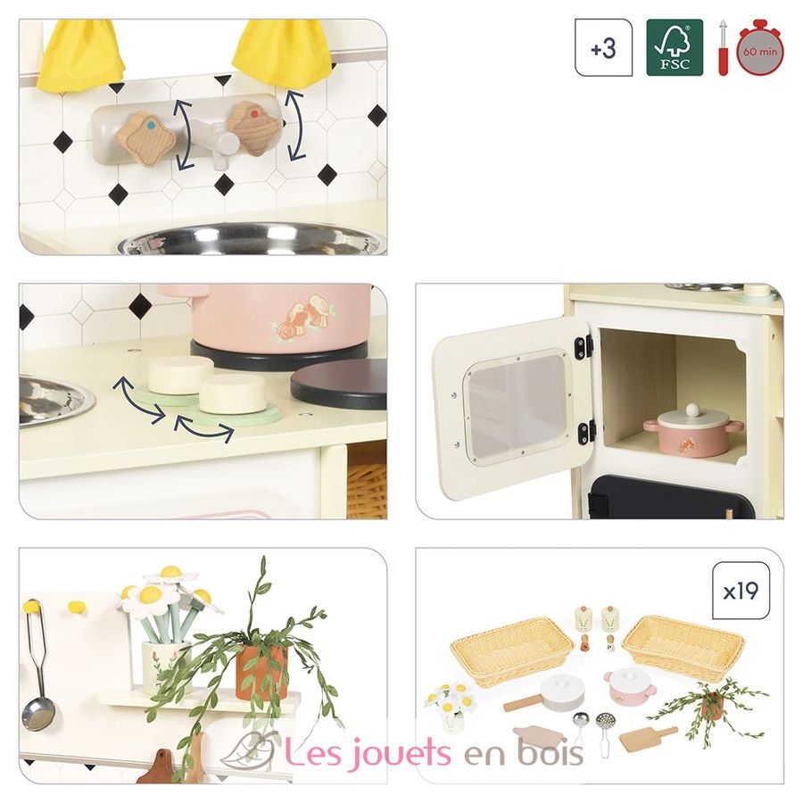 Large equipped kitchen, inspired by grandma's kitchen. Comes with 16 accessories, perfect for little chefs aged 3 and up.