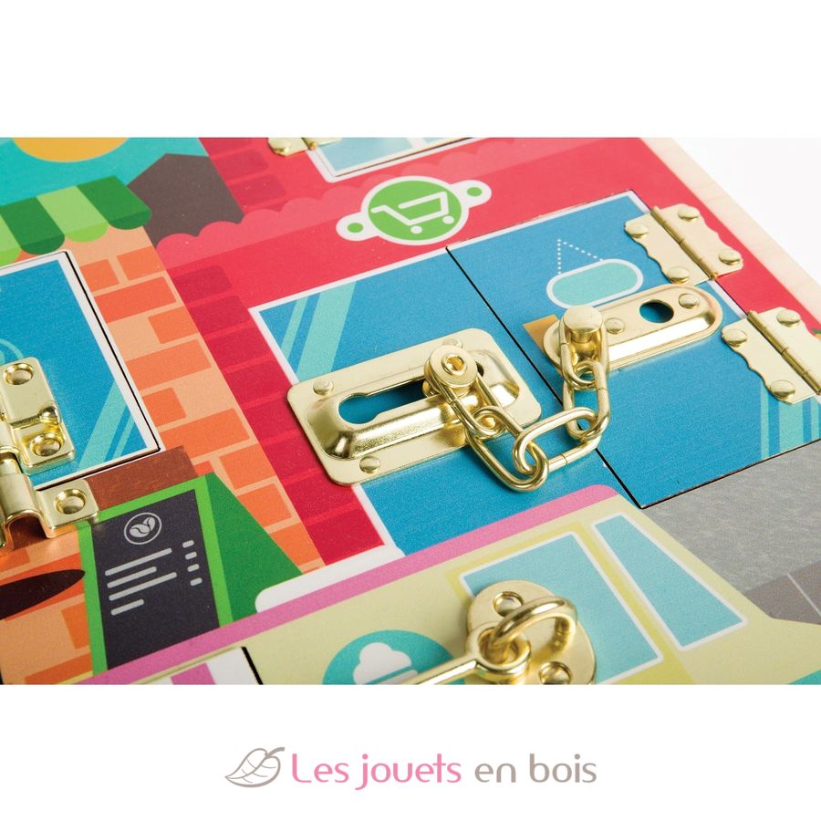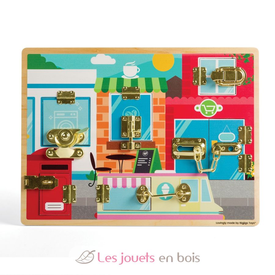 Once children have mastered opening the different locks, behind each door of this Montessori-style activity board is a detailed scene. Prepare to unveil a laundrette, a cafe kitchen, a cosy lounge, a sack of mail, supermarket shelves, and the inside of an ice cream van.