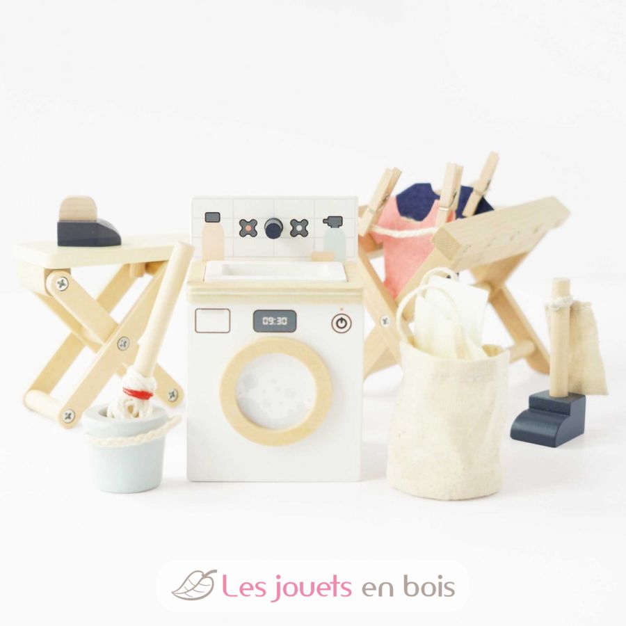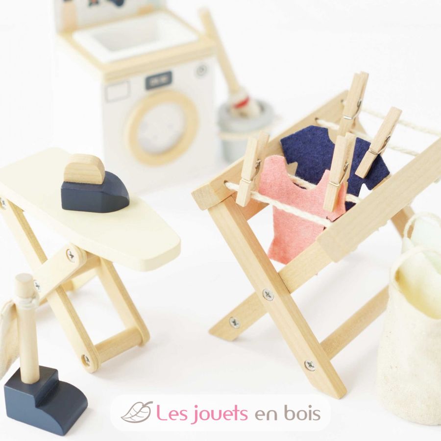 This 16-piece FSC-certified wooden set includes a washing machine, a folding clothes horse, an iron and a folding ironing board, 4 miniature coat racks, felt clothes, a laundry basket, a vacuum cleaner, a broom and a bucket.