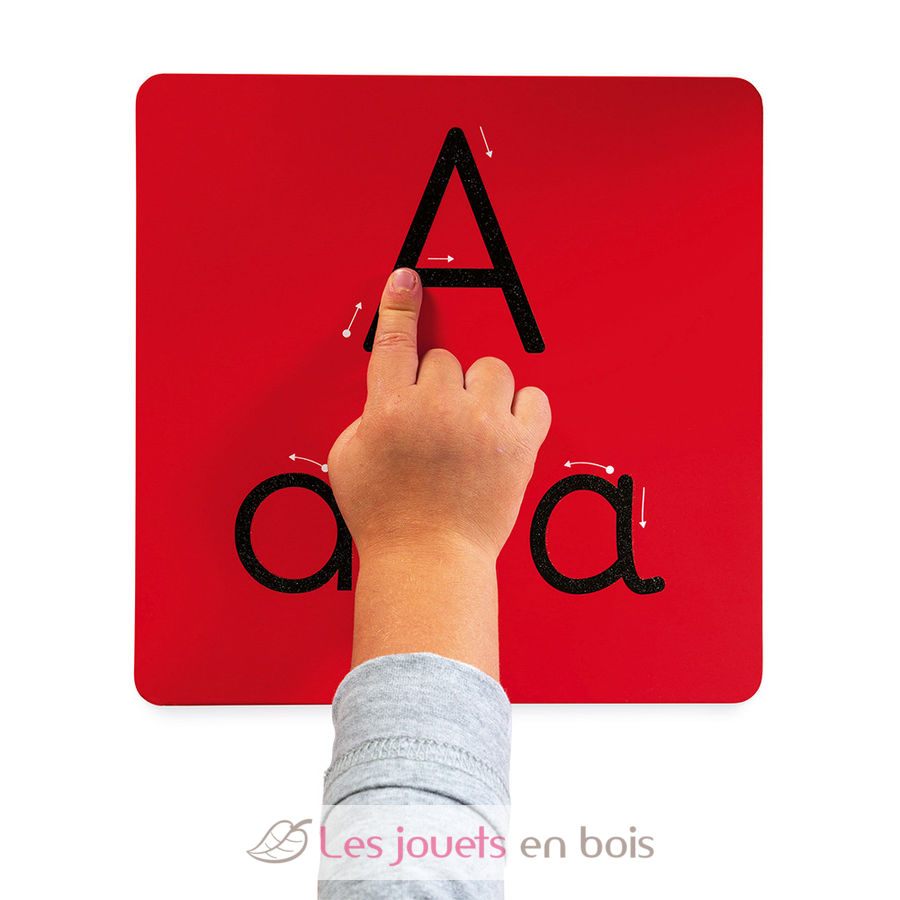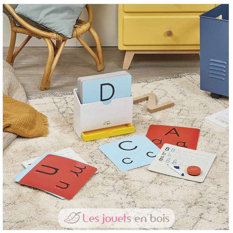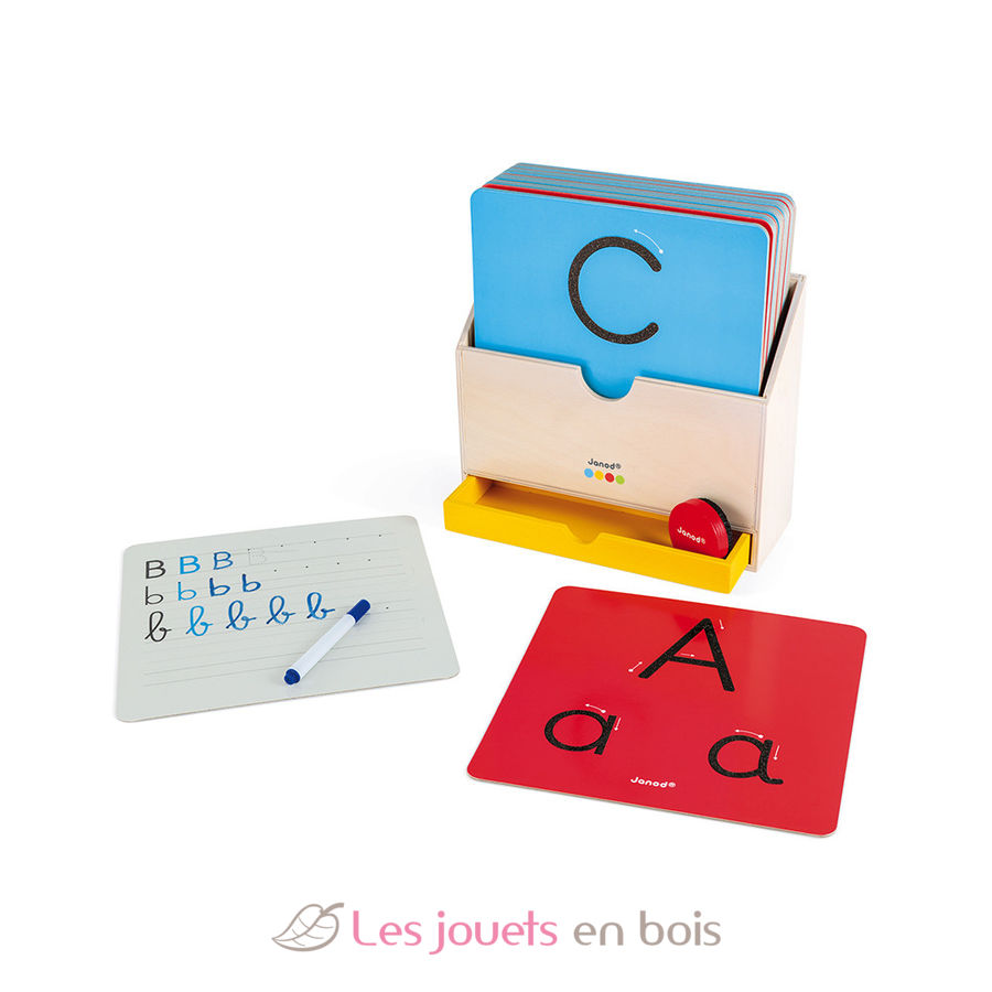 This educational game is ideal for discovering the letters of the alphabet and learning to write them, little by little. Each card corresponds to a letter and this letter is embossed on the front in 3 forms (uppercase, lowercase and cursive letter), complete with directional arrows, so that the letter can be written correctly. The embossed detail allows children to run their fingers over the letters and get a feel for the shapes and direction of writing. On the back, the child will discover an erasable side upon which they can practice writing the letter according to the model.