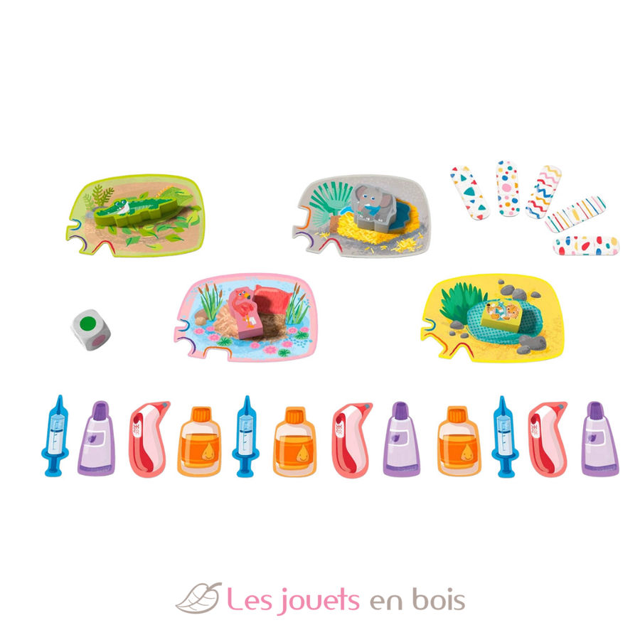 Oh dear … the animals are sick and need medicine right away. The crocodile has a toothache, the elephant has a cold, the cheetah has a tummy ache, and the fl amingo has a broken leg. Quick, bring your vet’s case and see what the animals need! Who will be the best veterinarian and the fi rst one to place all their medicine tiles?