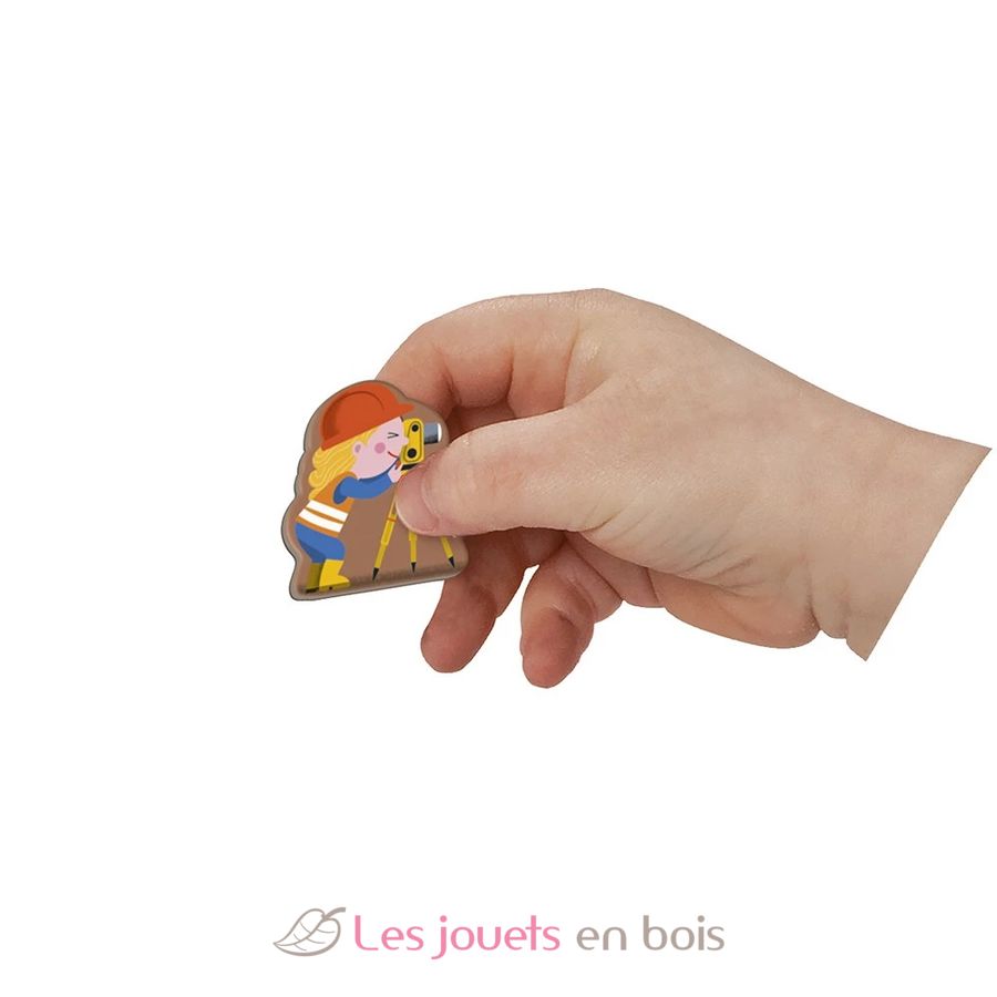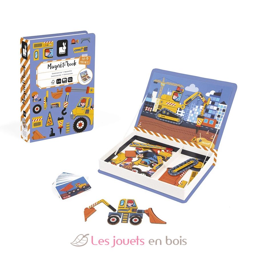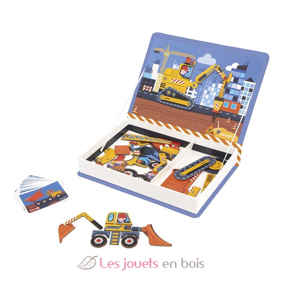 Composed of 50 magnets and 18 model cards. Once the book is opened, the aim is to make on the stage the same character or vehicle as indicated on the card thanks to the magnets. The child can also create crazy scenes by mixing the different pieces together.
