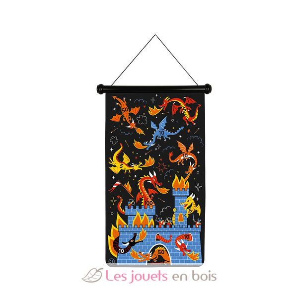 Challenge your opponents and get the most points with an accurate aim! The target fixes easily to the wall with the cord, and the 6 arrows are magnetised for increased safety. More than just fun, this game of skill is perfect for developing your child’s dexterity and concentration. Magnetic dart game on the Dragons theme. Comes with 6 plastic darts (3 red and 3 yellow) and a cotton string to hang it up. Rolled up in the box for easy storage. Made by Janod. Item number J02084.