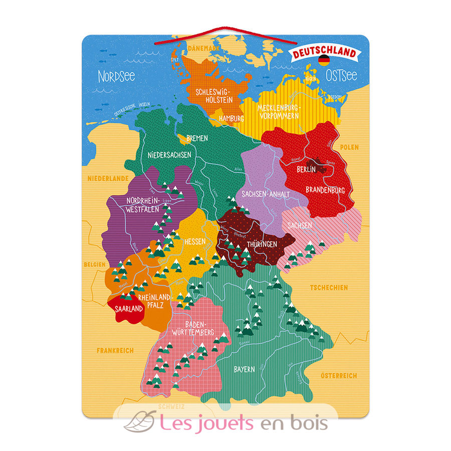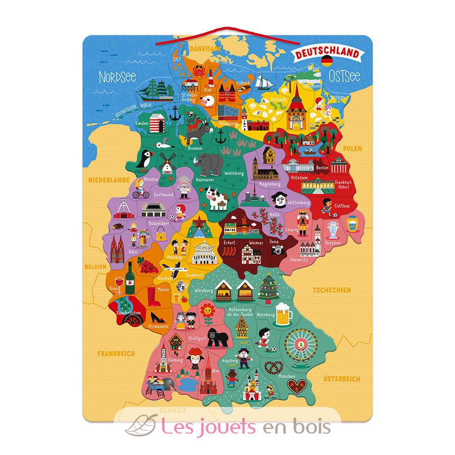 Learn geography while having fun! The magnets feature the regions (Länder) with illustrations of local specialties and well-known monuments. The Länder are grouped by colour. On the magnetic board are the same Länder, seas, oceans, islands and border countries.