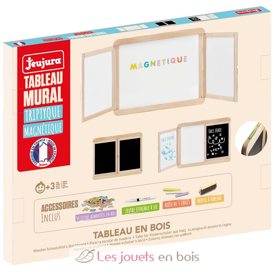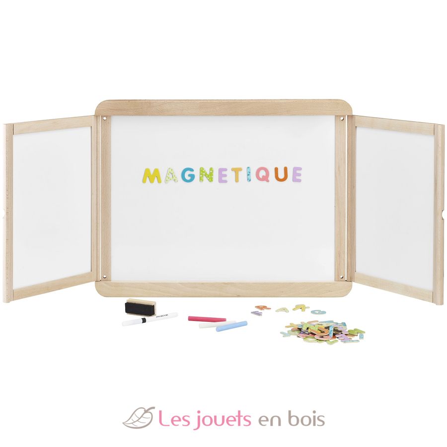 This children's drawing board features a natural wood frame, a central panel with a magnetic whiteboard for writing with a dry-erase marker, and two panels (one blank side and one side for writing with chalk). It comes with accessories: magnetic wooden letters, a box of 3 colored chalks, a dry-erase marker, and a wooden blackboard eraser.