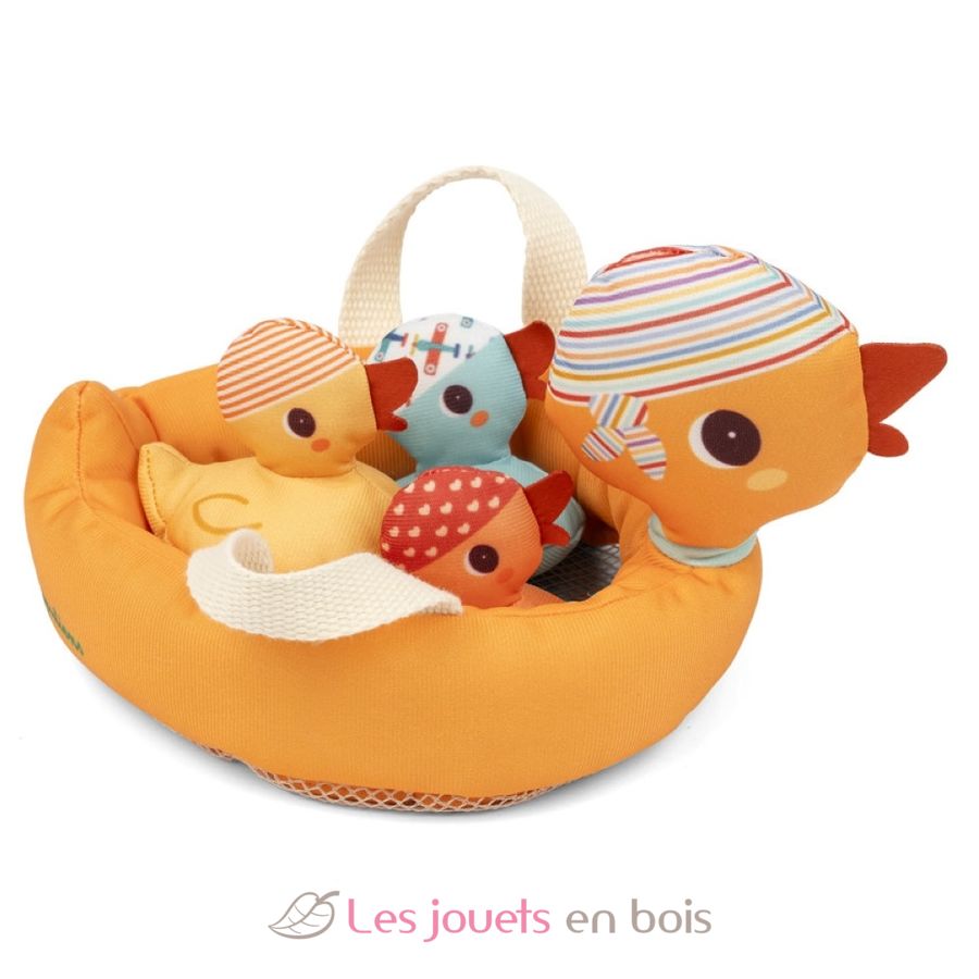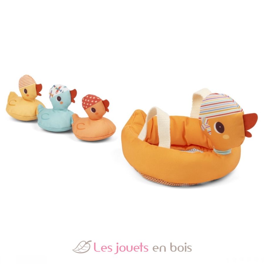 It is a magnetic bath toy: the three little ducks can float separately or together, one behind the other. Not even afraid of the current! Like children, our little ducks love their freedom, but also to find each other and follow their siblings everywhere. Each little duck is a different color and sports a pretty patterned bandana. But that's not their only special feature! Under each of them, a hidden number is to be discovered: perfect when you start to get familiar with numbers. This educational bath toy would not be the same without mother duck. She also floats on the water and welcomes her little ones on her back made of a net: also very practical for optimal drying outside the bathtub. Equipped with handles, it is super easy to carry in the bathroom and outside! With this duck bath toy, baby is entertained by the little colorful ducklings that float happily around him, so that bath time is marked by relaxation and sensory awakening.
