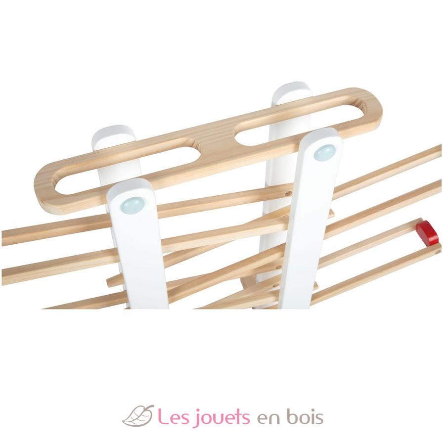 In addition to the 3 balls, there's also a rotating element and a fire brigade vehicle. This extra-large, robust marble run made of high-quality, solid wood offers not only loads of fun, but also promotes the development of motor skills and young explorers' creative development. The balls put on a fascinating, fun show on their path down from level to level.