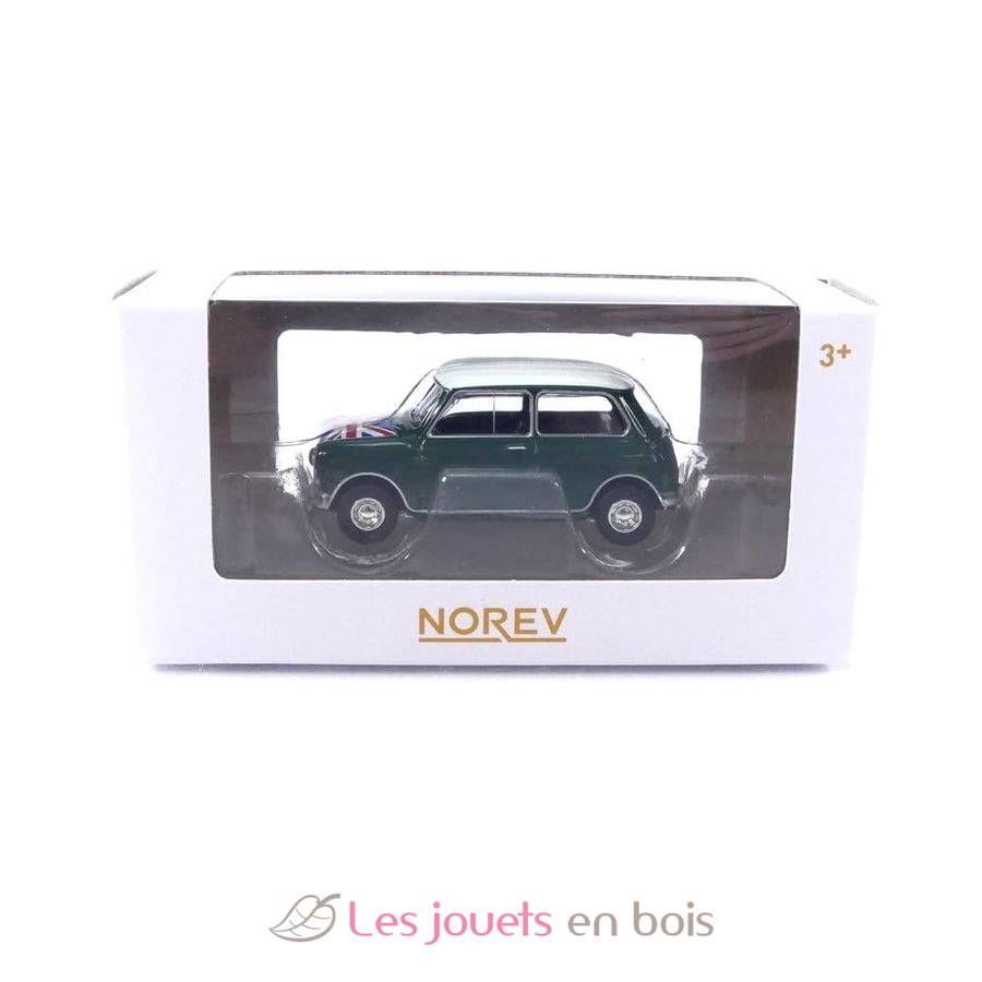 Discover this miniature metal model car with plastic parts, which represents the Mini Cooper with the British flag on the hood.