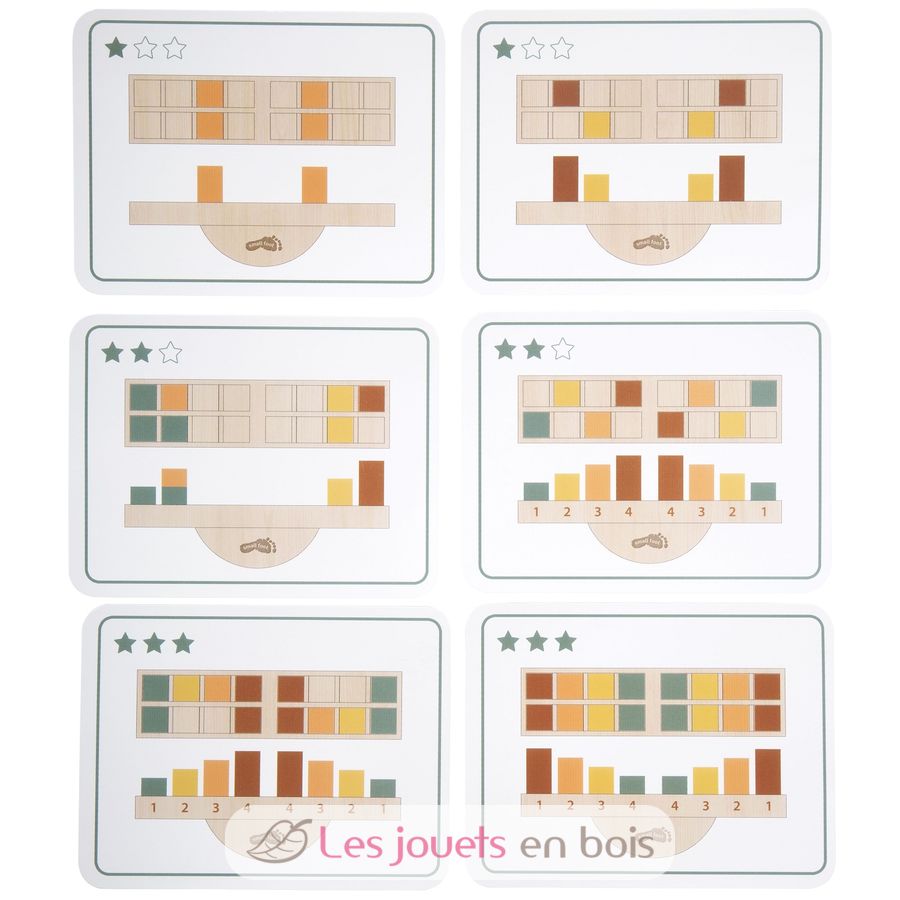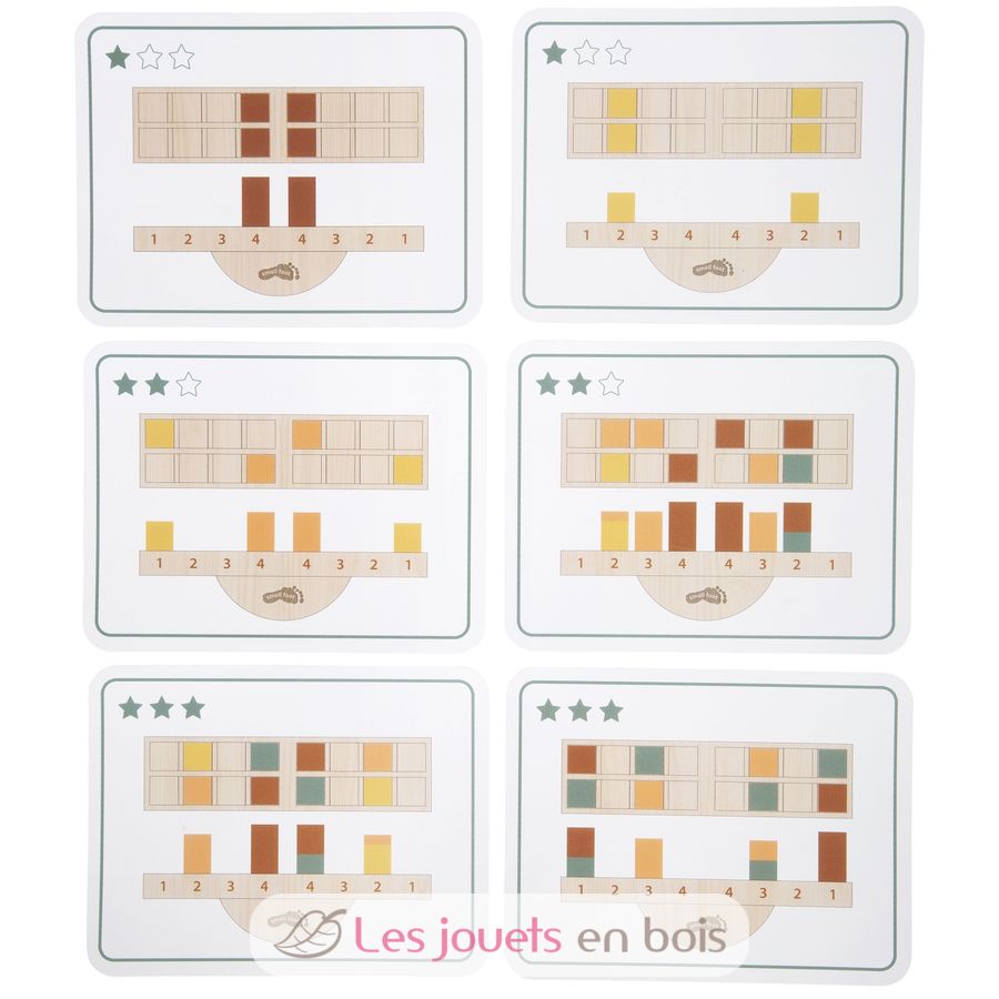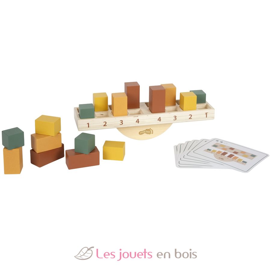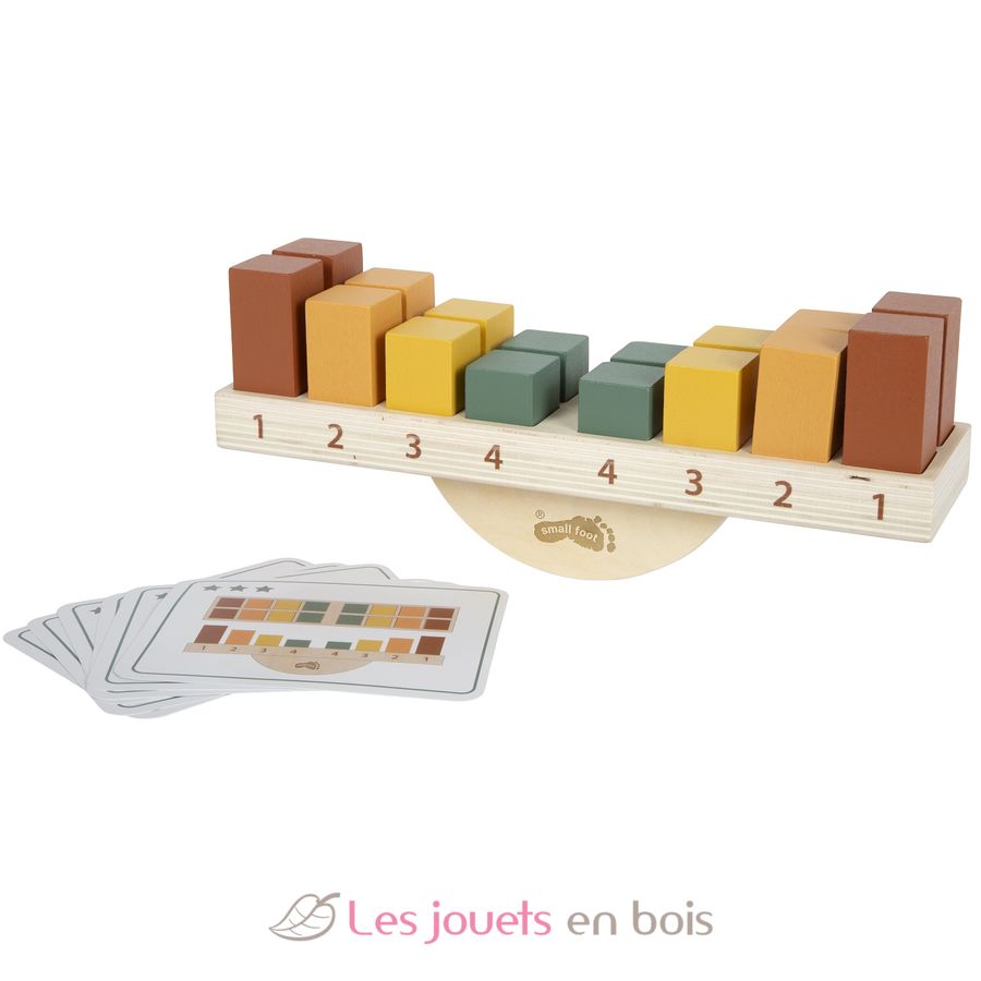 The base is a stable seesaw, in the recesses of which wooden blocks of different heights and weights must be skilfully placed to maintain balance. The game set includes 16 coloured wooden blocks and inspiring example cards that serve as instructions and add variety to the game with different levels of difficulty. Depending on their age and ability, children can stack freely or play according to a specific template.