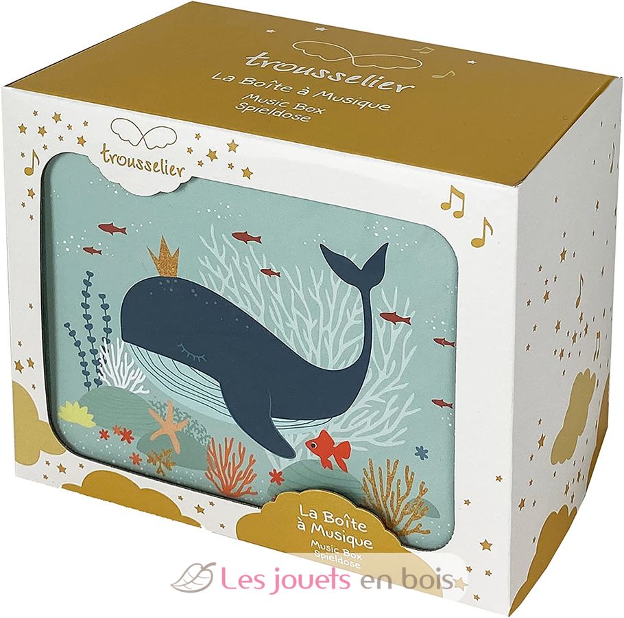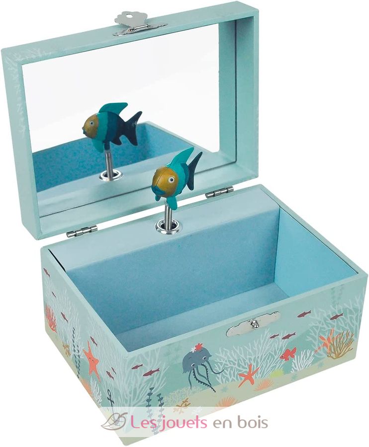 This box, made of solid cardboard, has a large compartment for small secrets, a drawer and a mirror. The fish figurine turns on itself when music is triggered, when the box is opened.