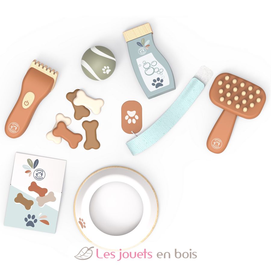 Features dog snacks, bowl, brush, collar and a few more wooden accessories.