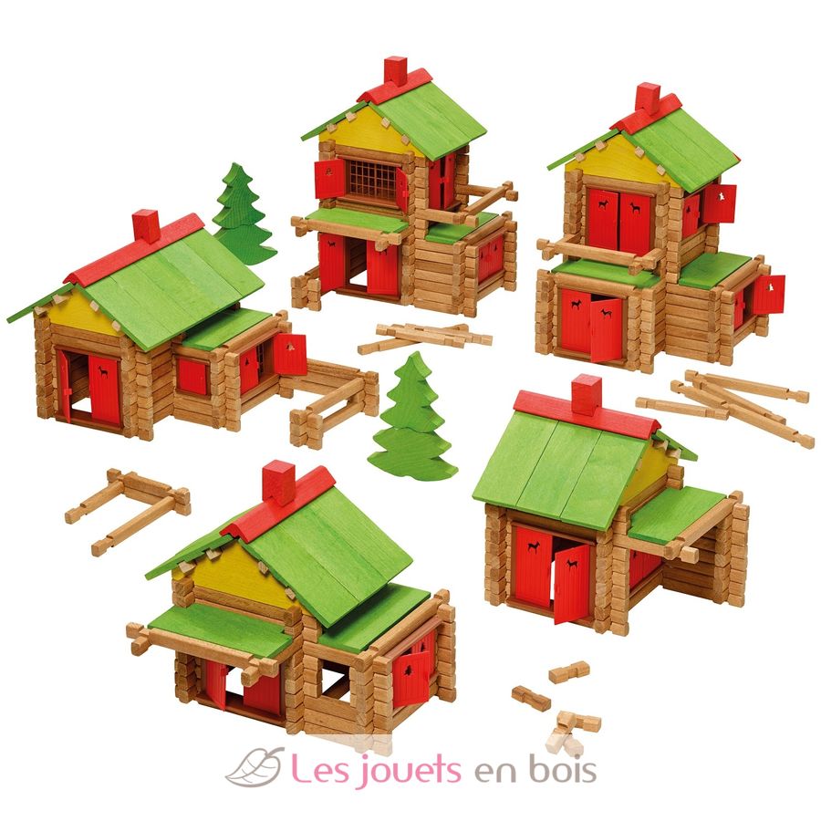 A natural and stained wooden construction game of 165 pieces, with assembly instructions to learn how to build an authentic wooden chalet.