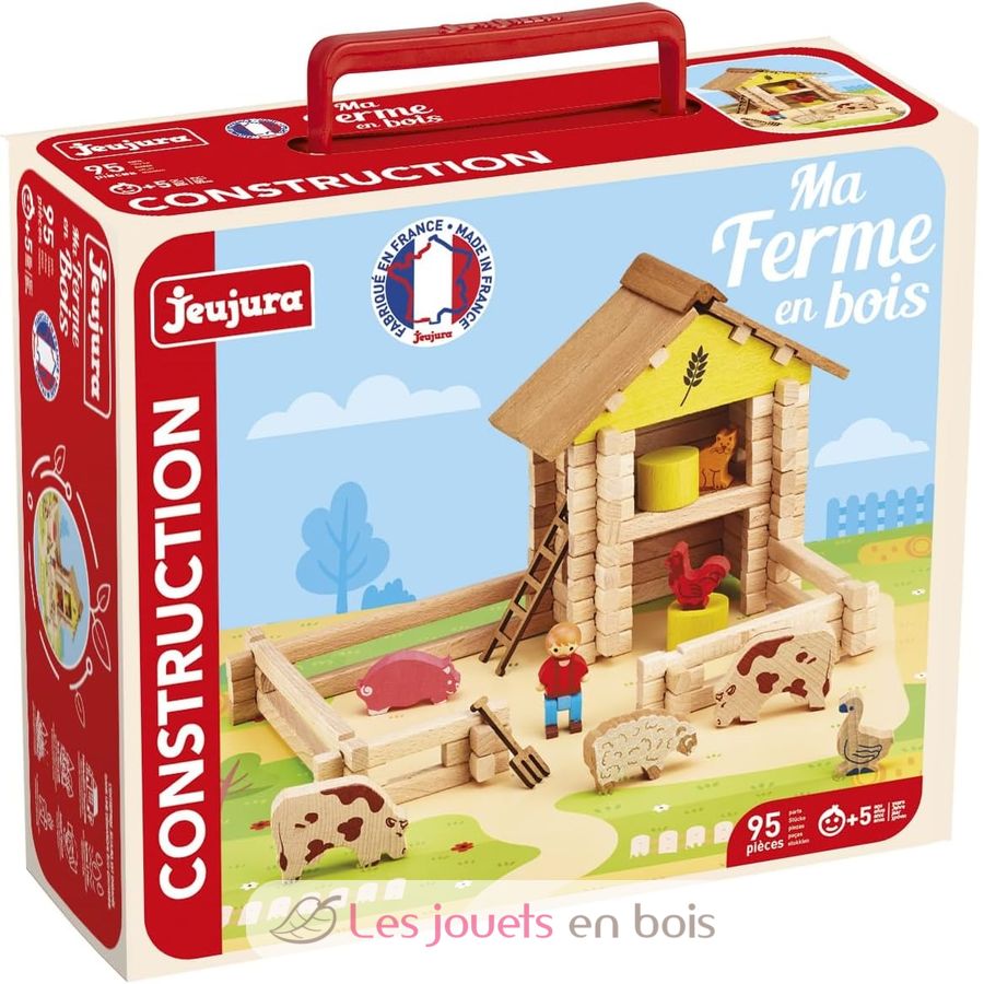 A 95-piece construction set made of natural and stained wood with a play mat, assembly instructions, accessories, and animal figurines.