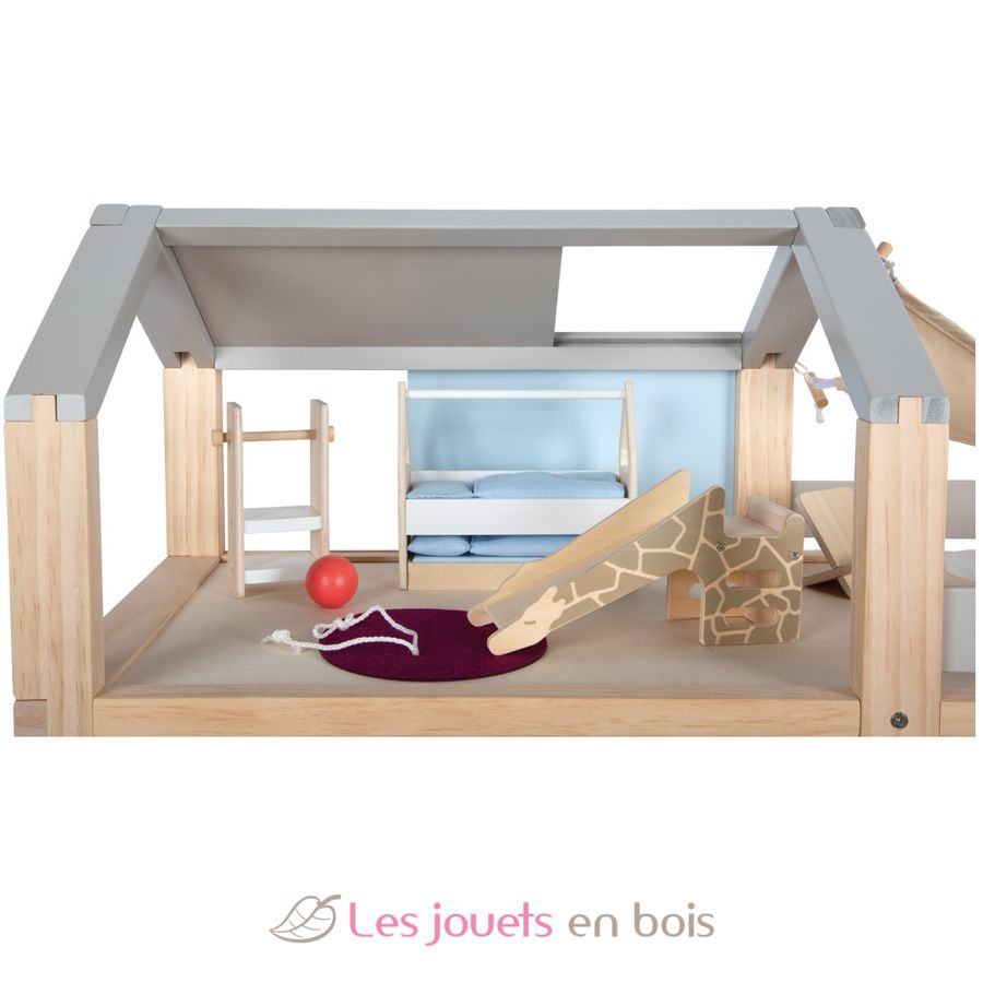 The house is thoroughly equipped with lovingly detailed doll house furniture that brings every room to life. No external accessories are needed – this doll house comes ready to play from the start! There is a cozy bedroom, a bright and cheery nursery with a giraffe slide, a stylish bathroom, a modern kitchen, a charming dining room, and a cozy living room. On the roof terrace, the furniture, a wooden horse, and a sun umbrella are open invitations to relaxation and play. Ideally suited for bending dolls with a length of 12 cm.