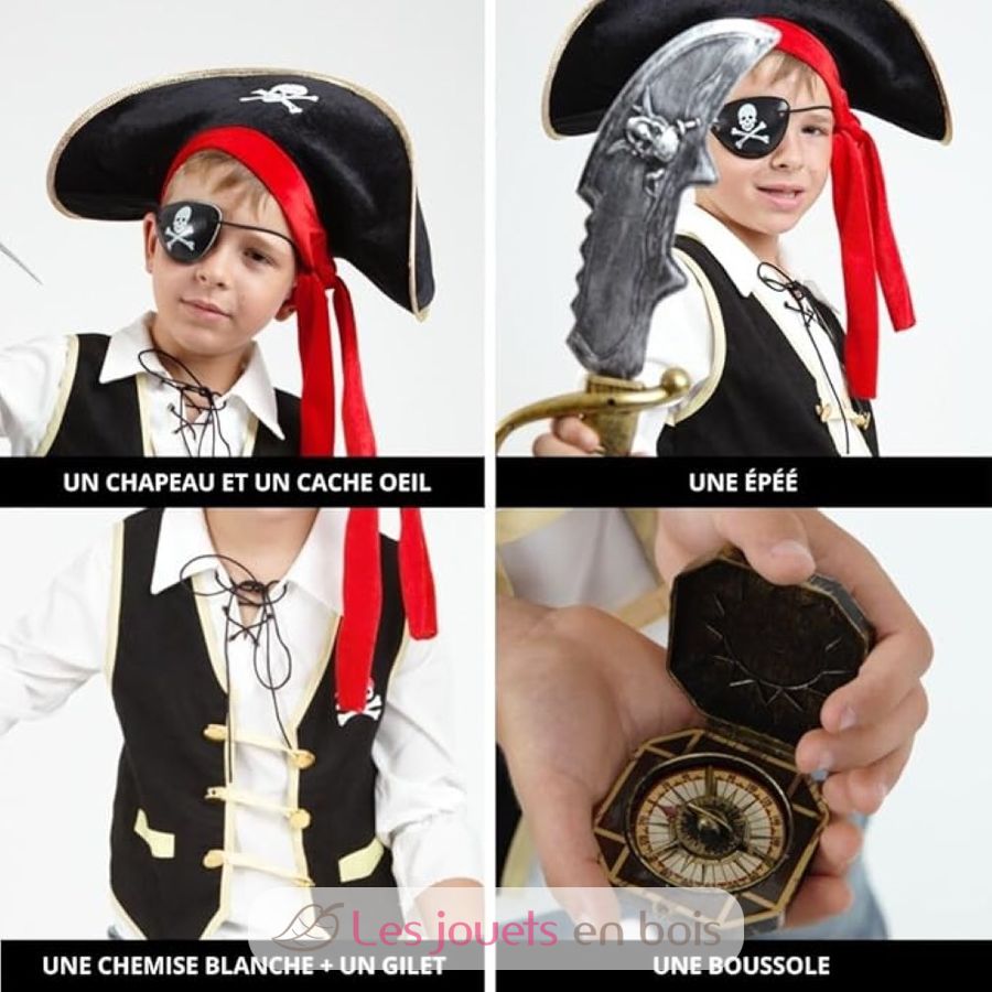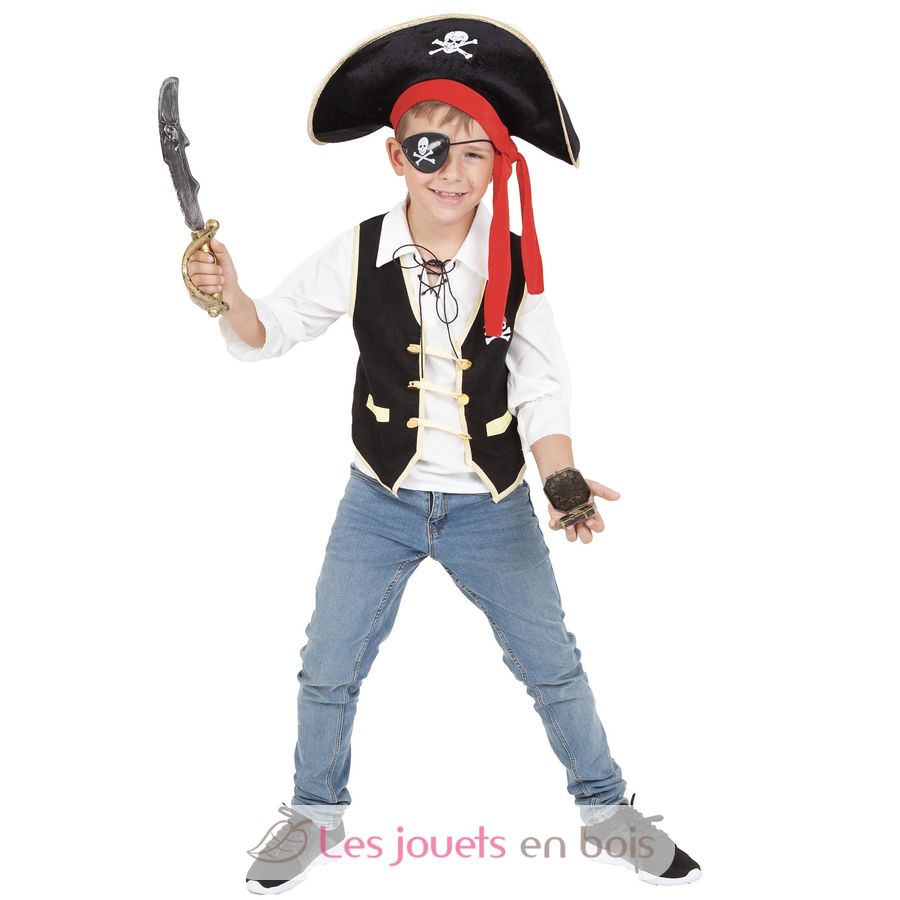 This children's costume includes a black pirate vest, a sword, an eye patch, a compass, and a pirate hat.