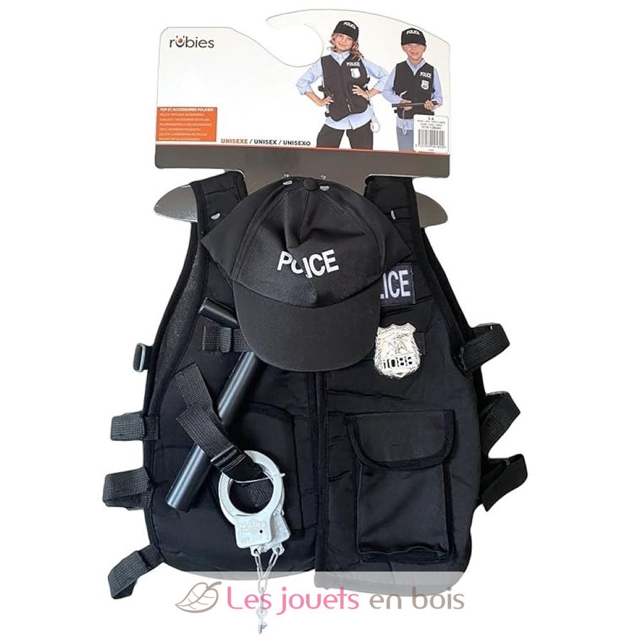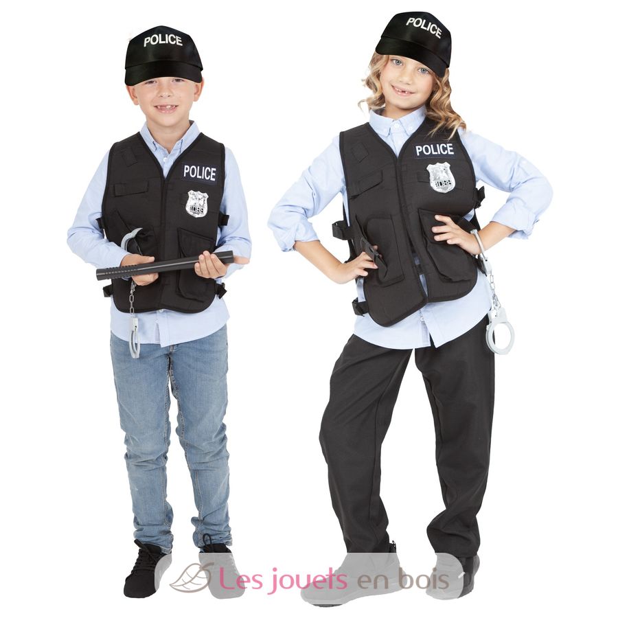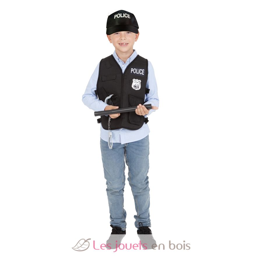 This children's costume includes a vest, a pair of plastic handcuffs, a plastic baton, a badge, and a police cap.