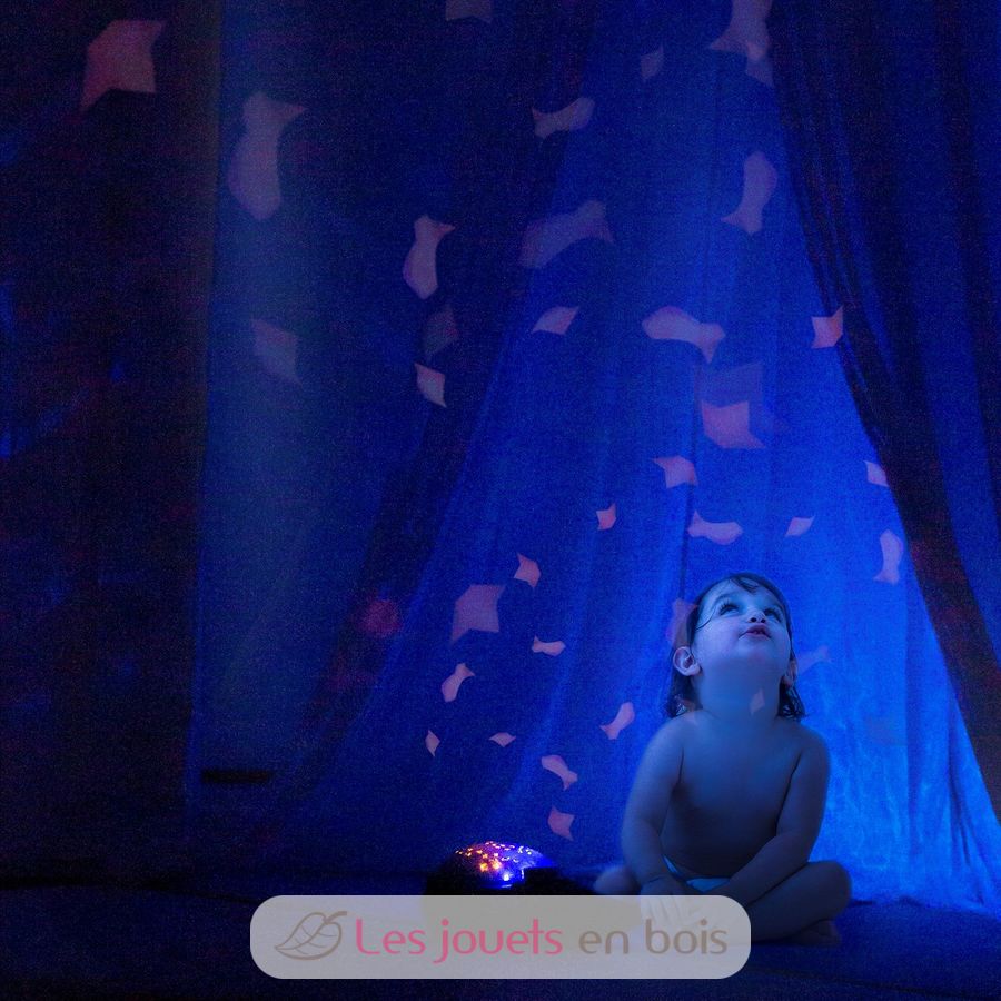This night light has 3 light intensities and an adjustable volume (4 sound levels or silence). It works with 3 AA/LR6 batteries (not included).