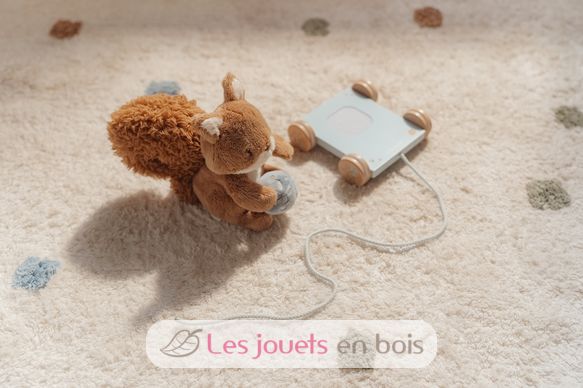 The soft and cuddly squirrel of this pull-along toy stands on a blue wooden carriage decorated with leaves. With the little string, your little one can guide him through the house and play. It's an adorable toy that encourages walking and helps develop motor skills.