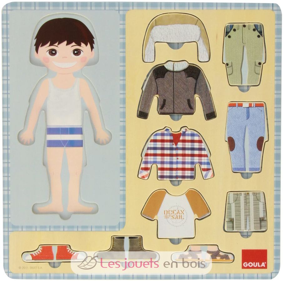 What clothes to wear today? Jeans or a skirt? Sandals or boots? Maybe a hat? It is up to you with this figure and these 10 pieces wooden clothes! The silhouette is recessed in the plate. Children can dress as they wish with different clothes.