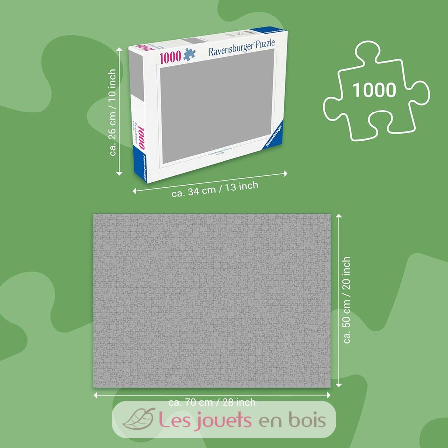 This box contains a puzzle of 1000 pieces. For trained puzzlers, the 1000 piece format is ideal for enjoying the puzzle activity, conducive to relaxation and relaxation. Each piece has a unique shape and allows a perfect assembly of the chosen image. Puzzle dimensions: 70 x 50 x 0,2 cm.
