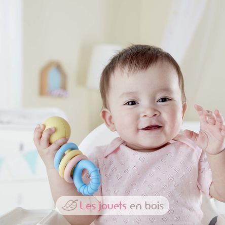 Made from a safe, rice-based material, the happy face comes with three movable rattling rings to stimulate sensory awareness and one teether ring to chew.