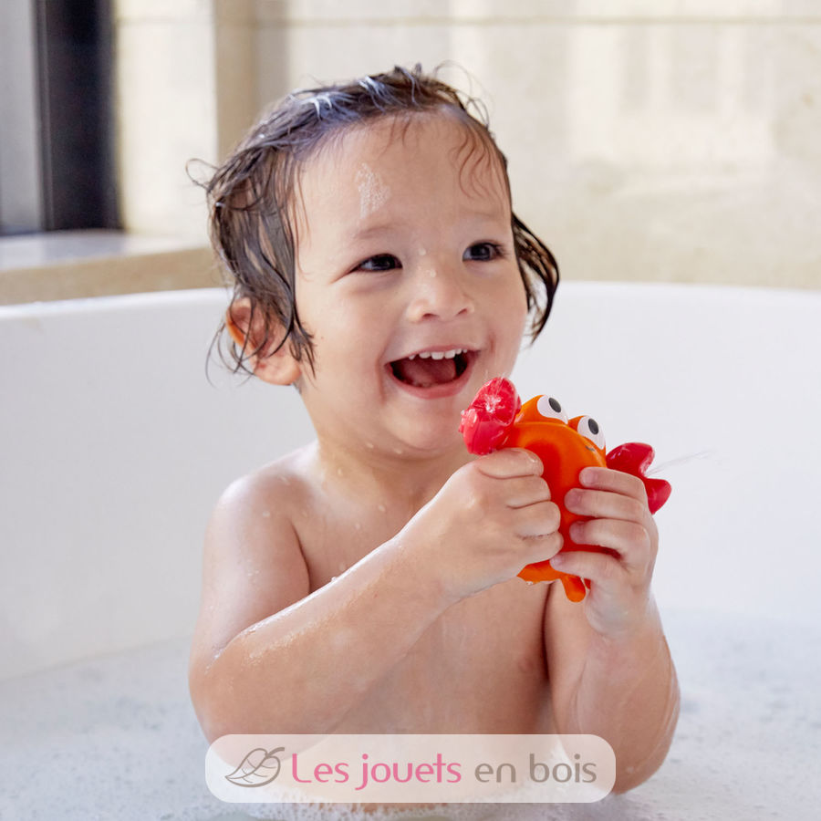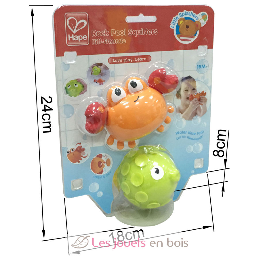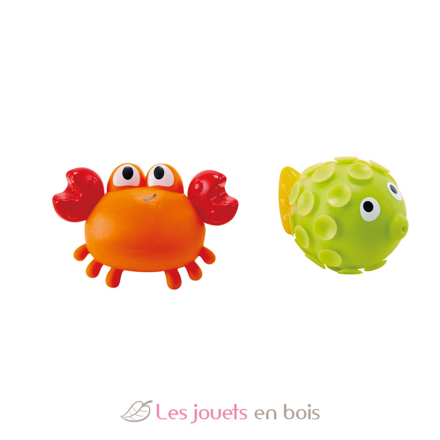 This cute crab and fish have a cheeky secret! If you fill them up with water and squeeze them they will shoot out water. Brings splashy fun to bath time!
