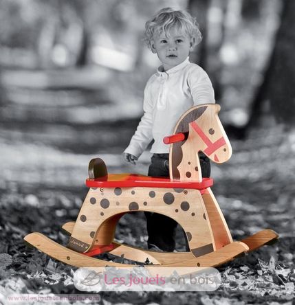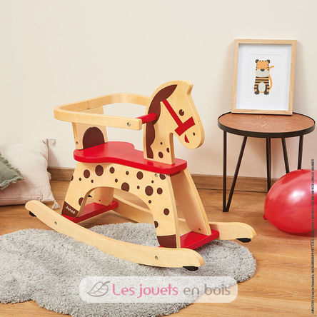A wooden rocking horse named Caramel from Janod. A rocking horse with removable saftey bar.