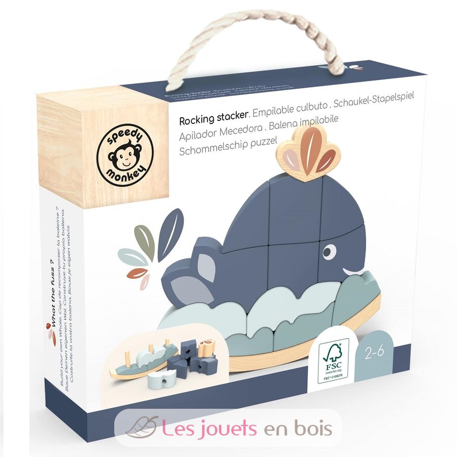 Rocking stacker whale, a wooden stacking game made by Speedy Monkey.