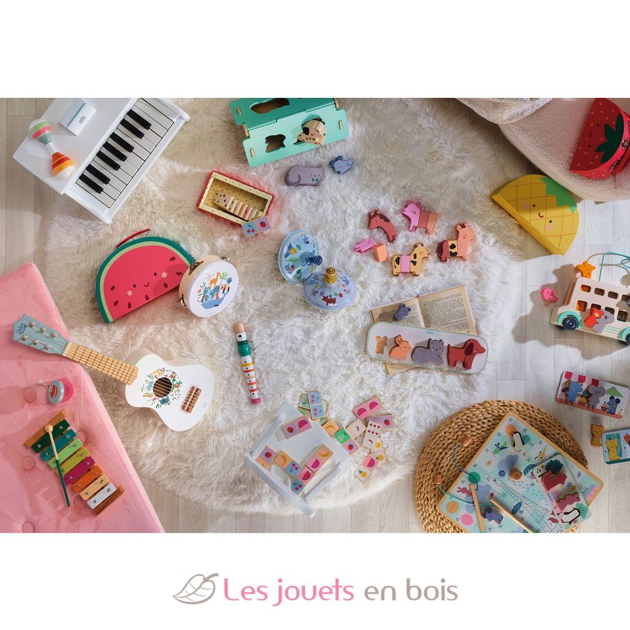 This musical toy is beautifully illustrated by artist Sarah Betz. A wooden guitar with nylon strings, supplied with a spare string and a pick.