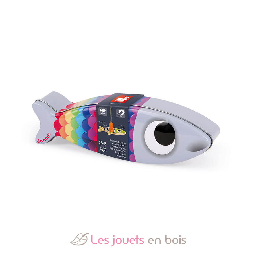 Fishing game composed of 10 funny and colourful sardines, supplied with 2 fishing rods in wood, with a hook in the shape of fish. Heat transfer printing on one side and metal rivet fixed on both sides of the fish for more safety because you cannot take the rivet out. Metal sardine shaped box printed on both sides, embossed on some parts (eyes, scales).