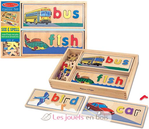 Complete a puzzle to spell a word! This handsome wooden puzzle set helps children gain familiarity with the letters of the alphabet and their sounds as kids develop a sight-reading vocabulary. The letters are also wonderful for stenciling and lots of learning games. More than 50 colorful wooden letters fit into the eight two-sided cutout boards to spell three- and four-letter words. All this spelling and fine motor fun fits into one compact wooden storage case!