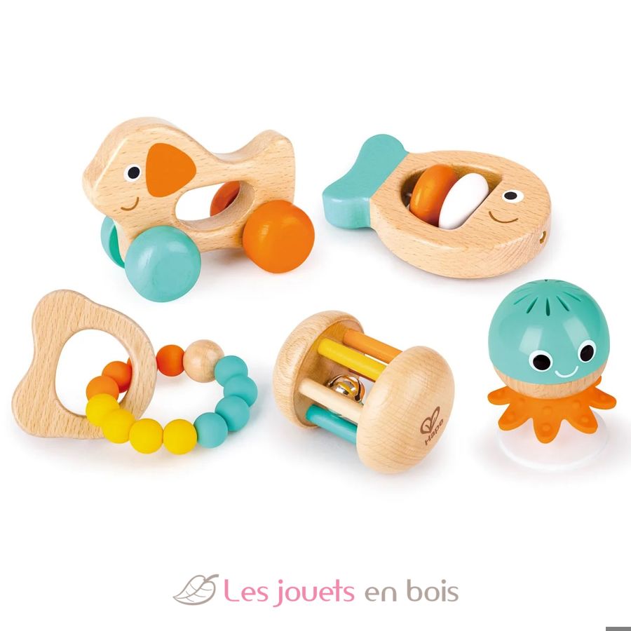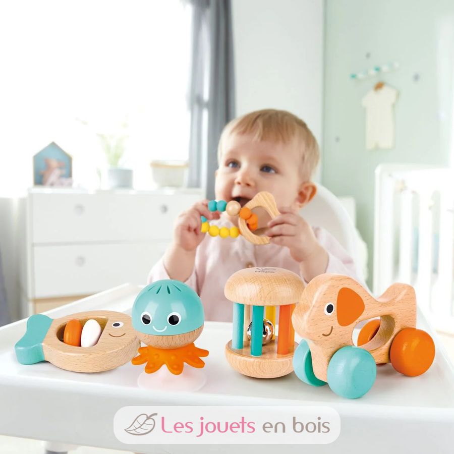 Sensory toys gift set, a set of wooden baby toys made by Hape.