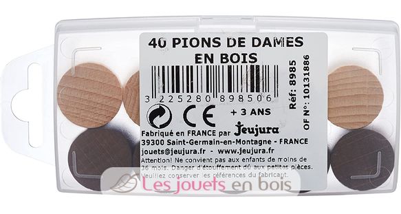 Set 40 wooden pawns of checkers. Made in France by Jeujura. Item number 8985.